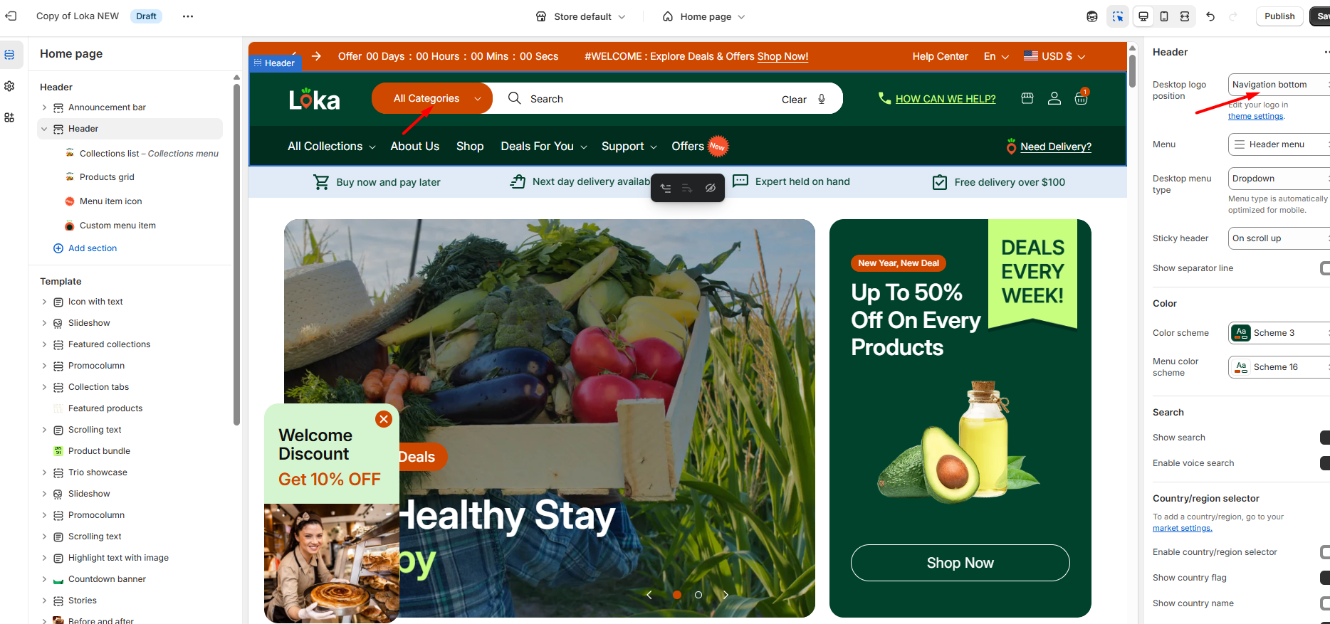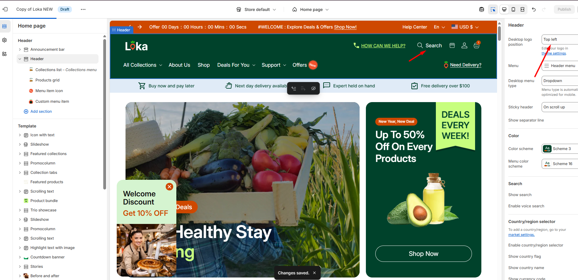 Show search | Activate this option to display a search bar, making it easy for customers to find products or information on your store. |