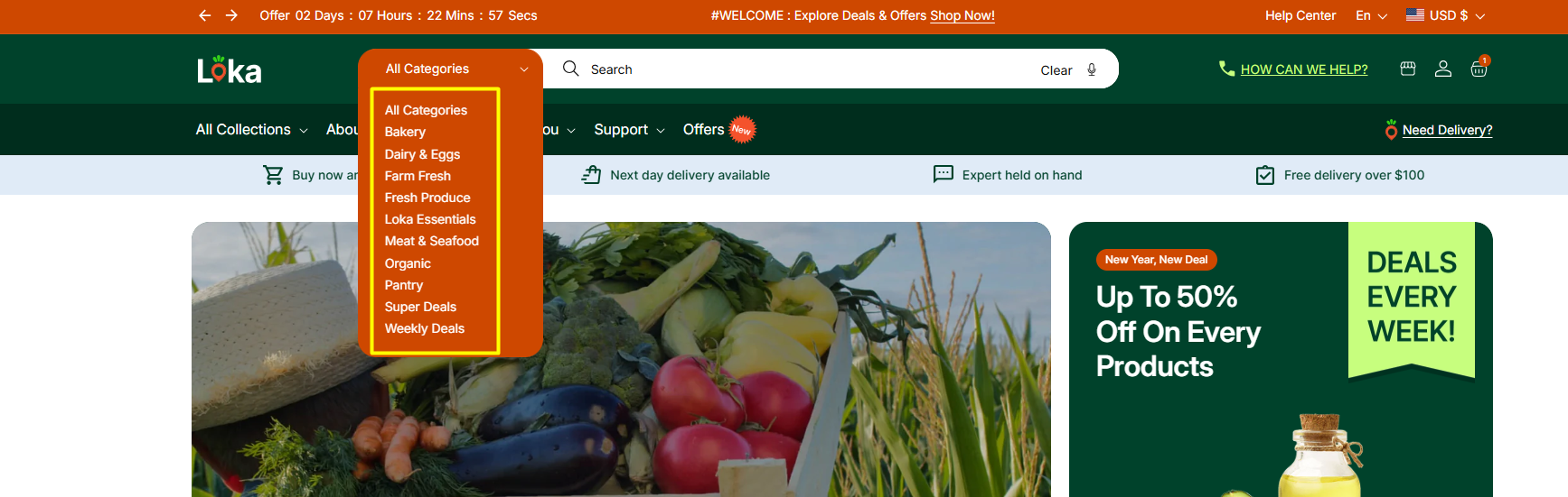 In Navigation bottom style, the search bar is extended with a text input field, and an “All categories” filter is available to search either across all products or within a specific collection. To enable or disable the “All categories” filter, go to Enable search suggestions in the settings. 👉 Check the screenshots below the table to learn more. |