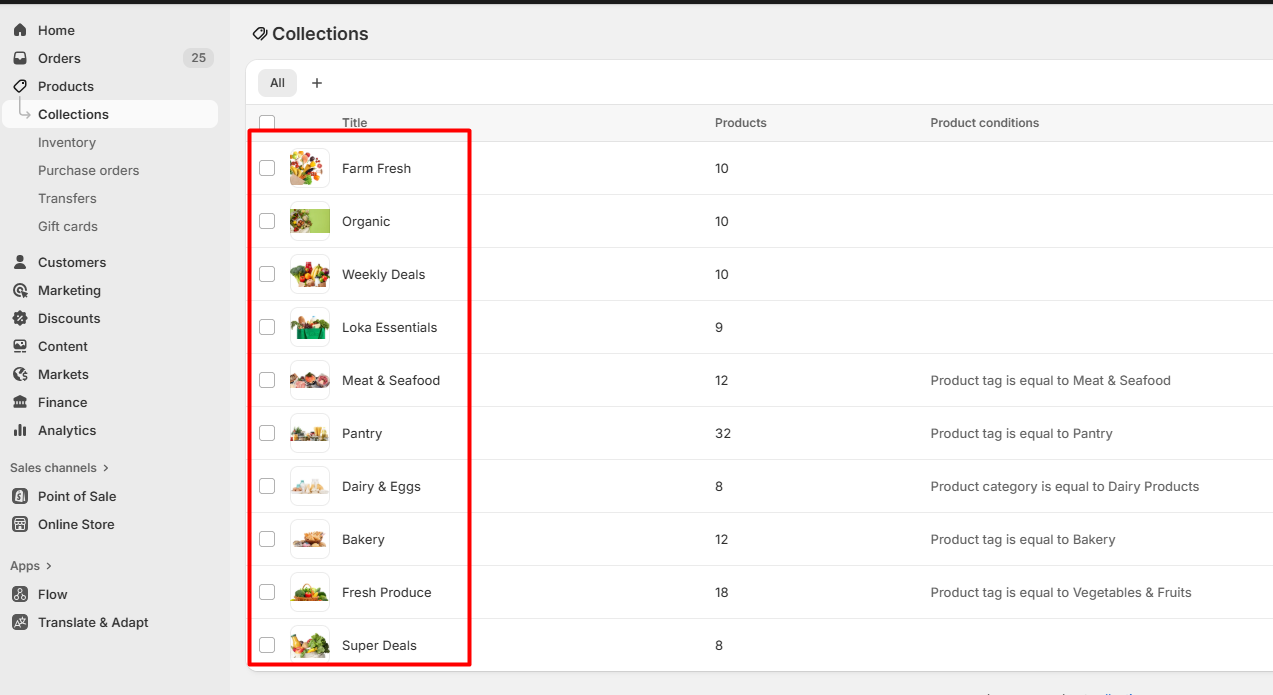 - All collections – displayed in alphabetical order, based on the collections added in the Admin → Collections tab.