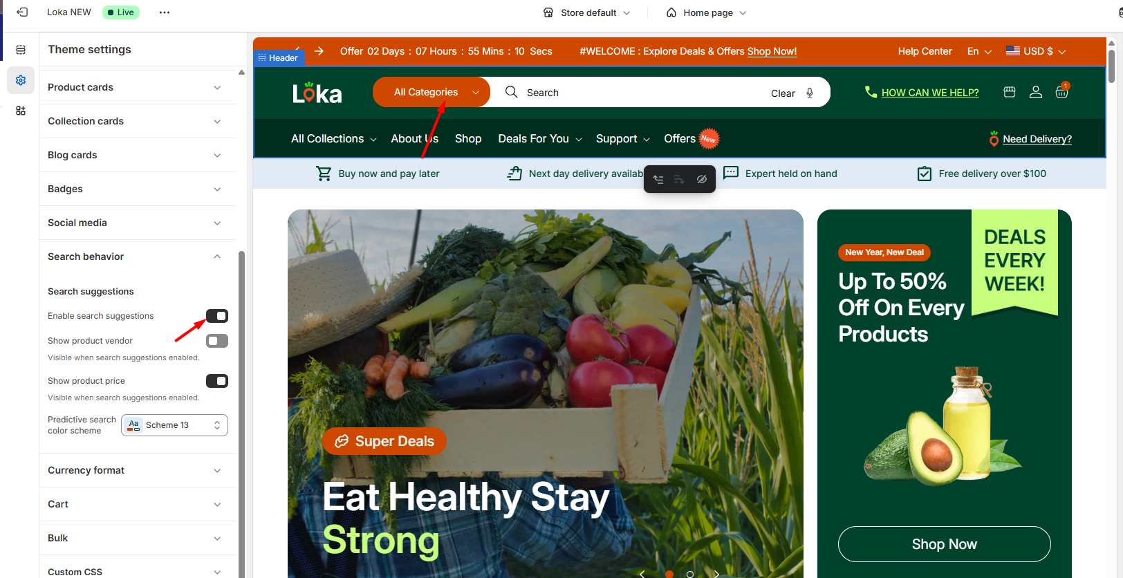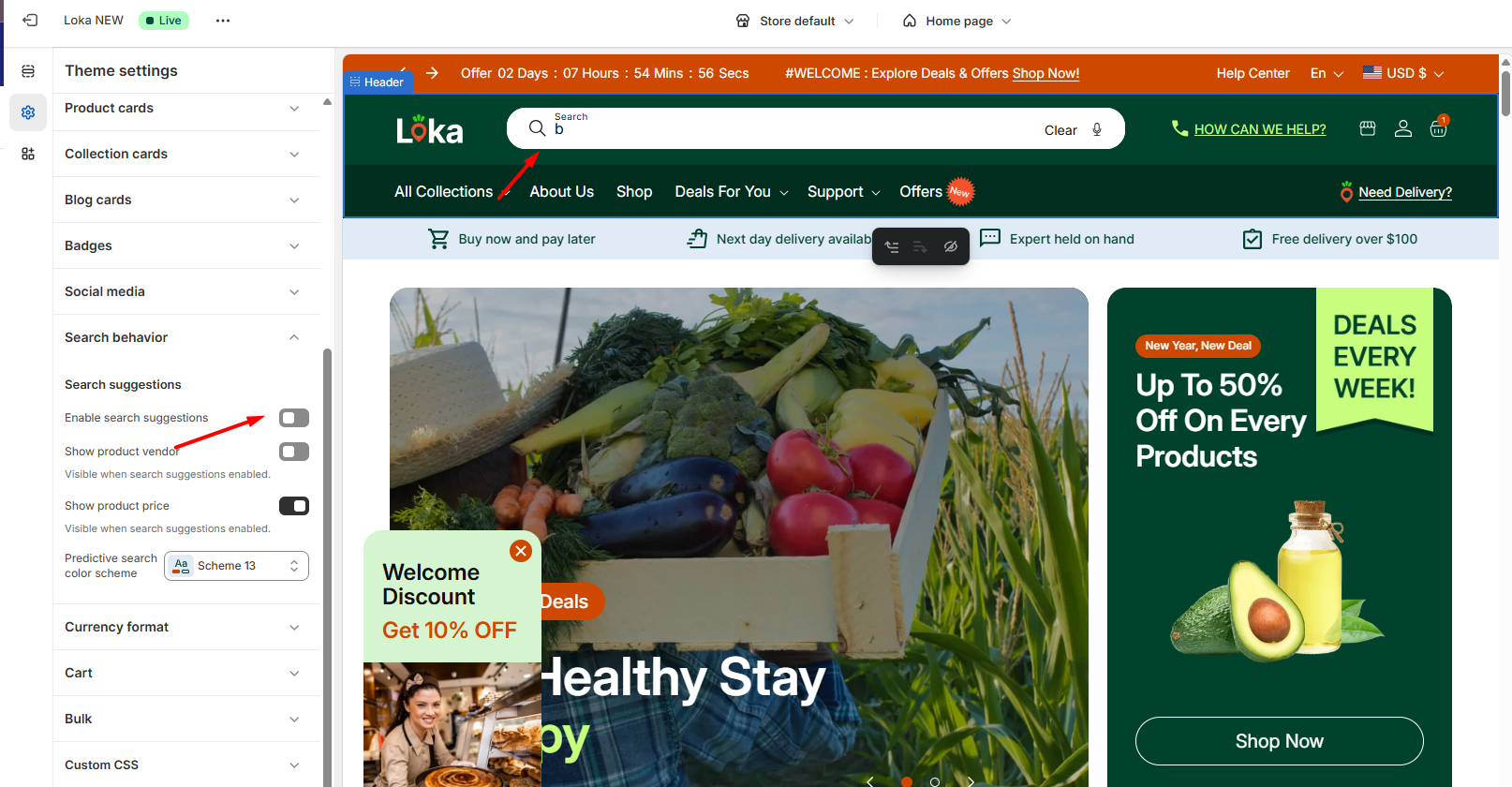 Show product price | This setting allows you to show or hide price information in search suggestions. *Price is visible when product suggestions enabled. |