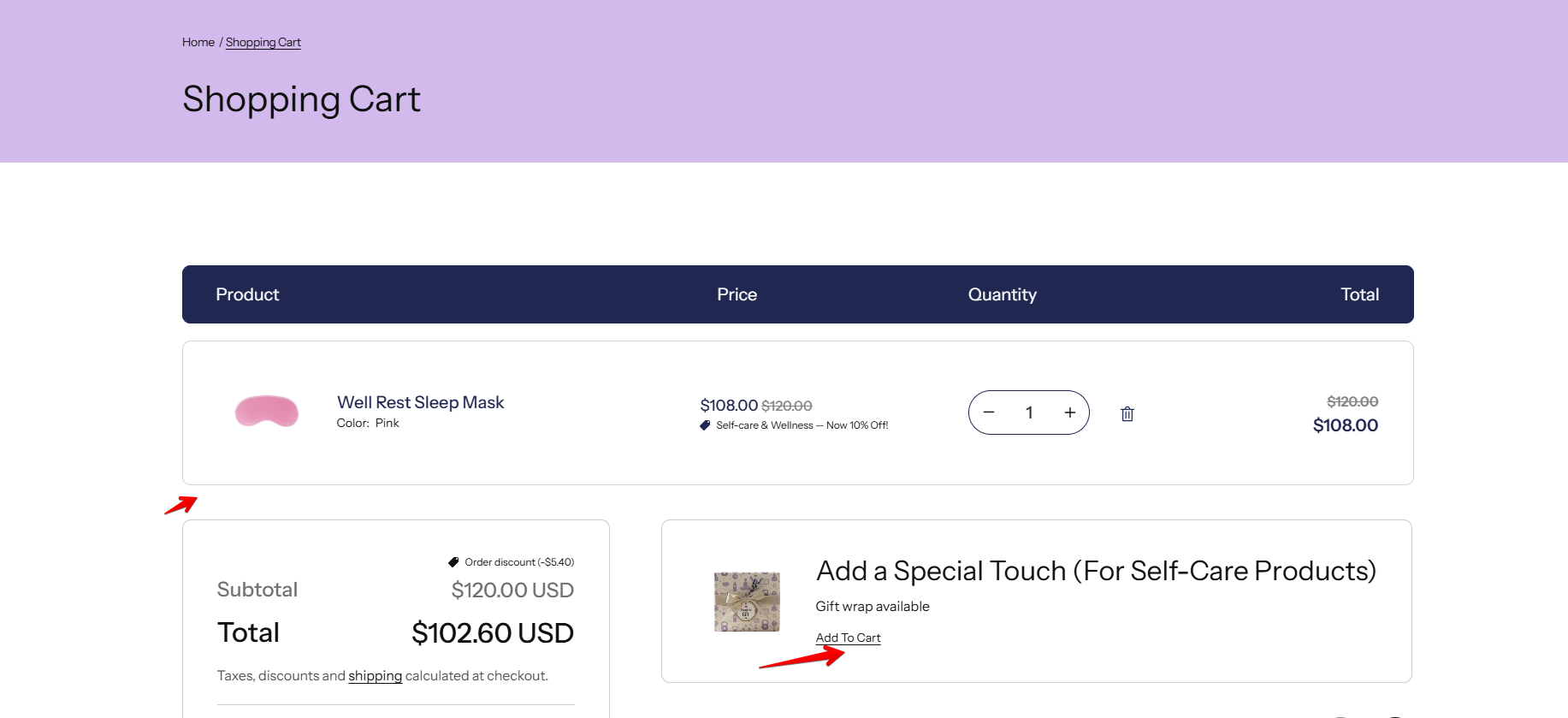 | Gift wrapping product | You can add a gift wrap product here. Once it is created and added, the gift wrap block on the product detail page will indicate that gift wrapping is available. For more information, please refer to this article: https://docs.muup.co/article/4365-gift-wrapping After the gift wrap product is added, it will also appear on the cart page. Customers will be able to include it with their items and proceed with it through checkout. |