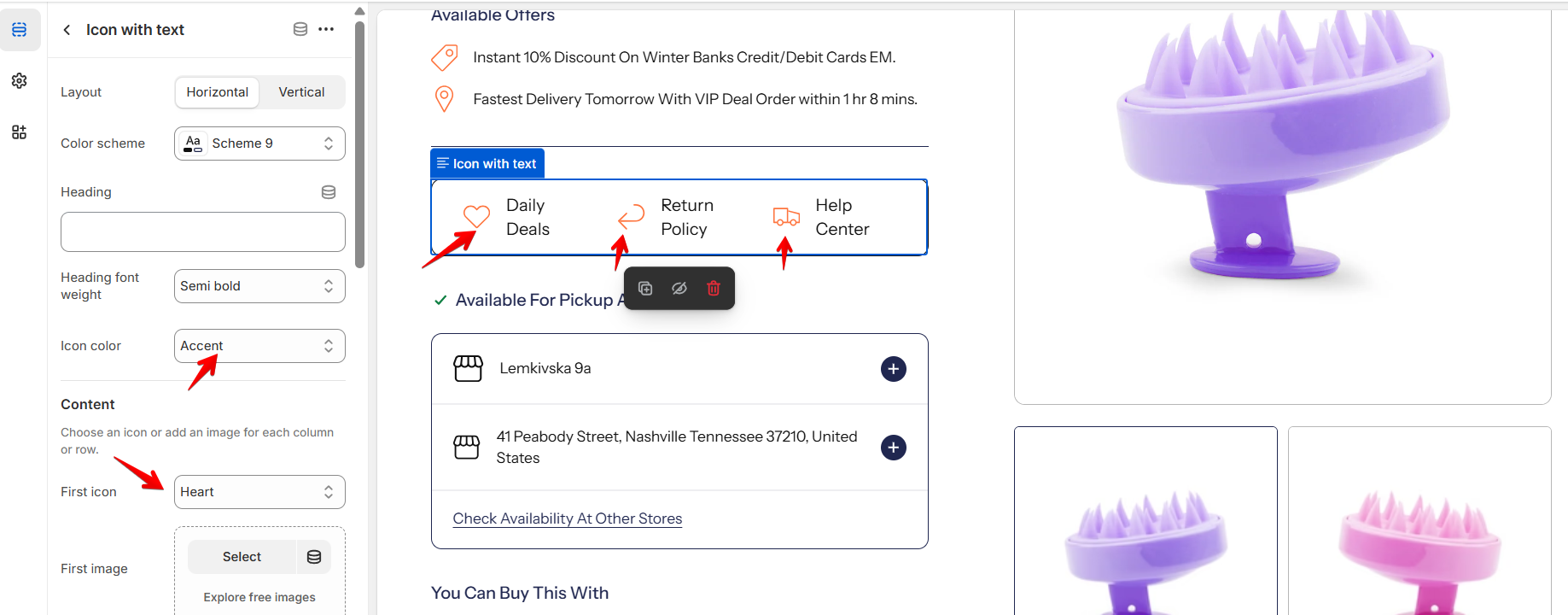 | Icon color | You can choose a color for icons if they are added from the list of available Shopify icons. Three styles are available: