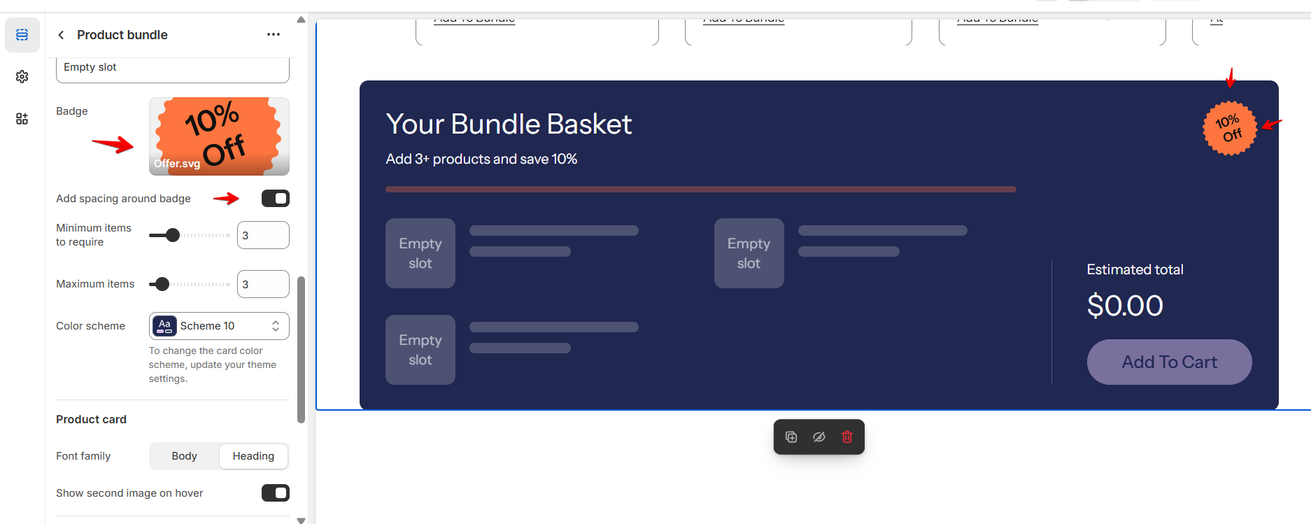 | Badge | Upload an image to display it in the top-right corner of the bundle. For optimal appearance, it's recommended to use a small image that serves as a badge. |