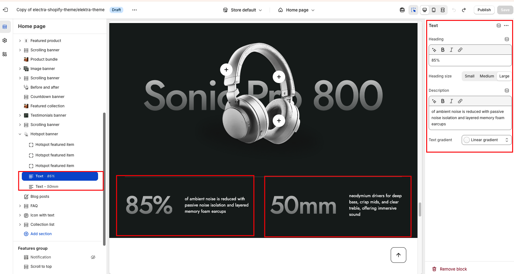 Note: You can add one or two text blocks to this section. They are displayed sequentially at the bottom of the section.