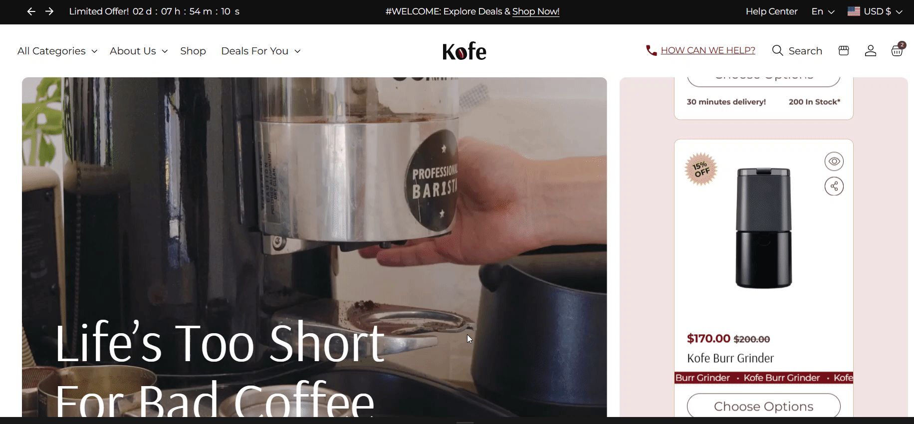 | Quick add | If you activate the Quick add option, then your customers can add an item to their cart from the product card. Choose from the following options: