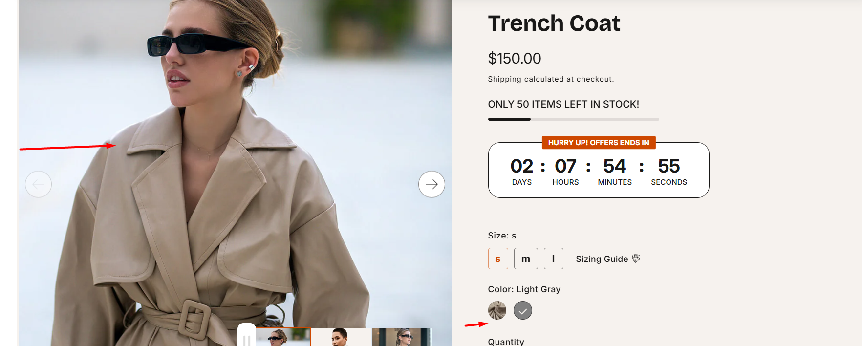 There are two ways to use color swatches. The first method involves creating a necessary list of colors that will be displayed as color swatches, showing the customer which colors the product is available in. The second method is similar to the first but expands your options for displaying the product's color. You can replace the usual color swatch with an image that will more informatively showcase the product variant.