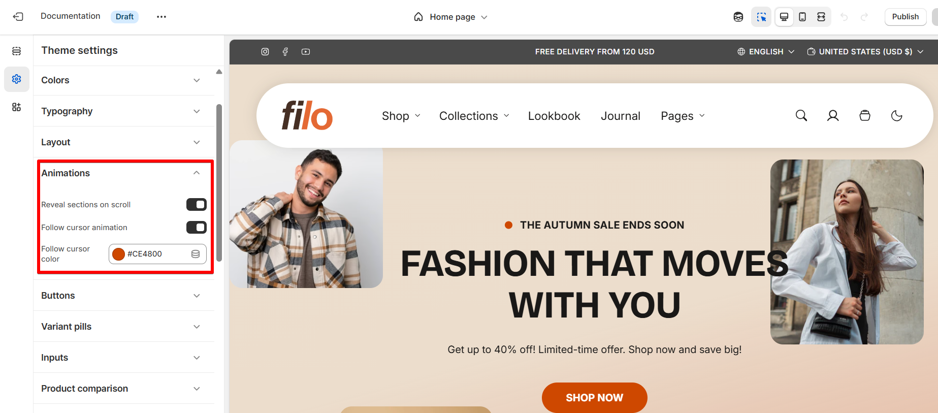 Animations allow you to add movement and visual interest to your online store. You can activate a fade-in animation that reveals your store's sections on scroll. Additionally, a follow cursor animation can be added to create an interactive visual effect throughout the entire site.
