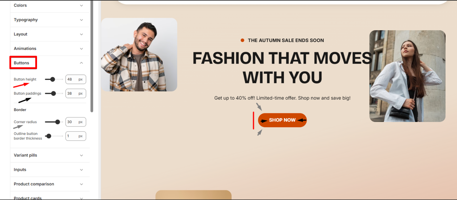 | Buttons paddings | Customize the inner spacing of buttons (left/right). Padding affects how much space is around the button text, influencing both size and readability. The range is from 20px to 60px. |
