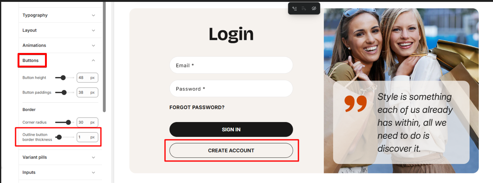 | Outline button border thickness | Adjust the thickness of the border for outline-style buttons. Use the slider to make the border thinner or thicker, depending on the desired emphasis and visual style of your buttons. The range is from 0px to 10px. |