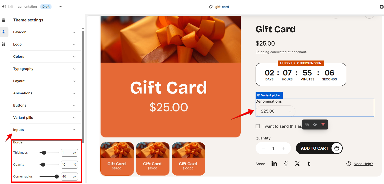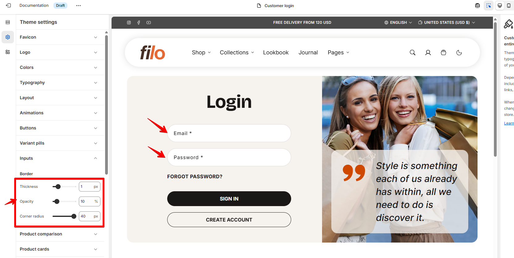 Inputs are interactive fields where customers enter information. You can customize their appearance in your theme settings to maintain a consistent look across your store.