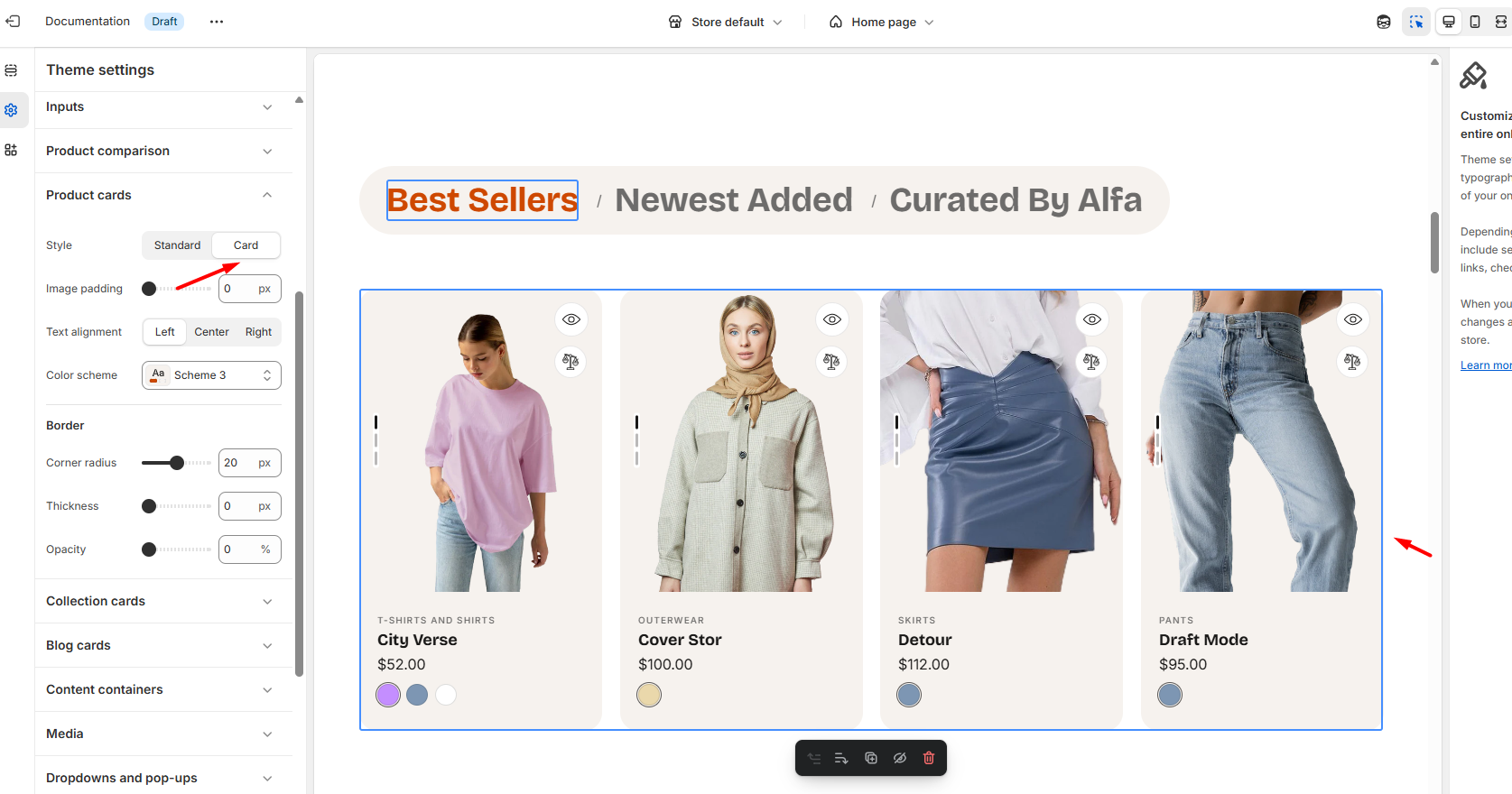 | Corner radius | Use the slider to control the corner shape of product cards. Achieve the desired level of roundness or squareness, aligning them with your design vision. The range is from 0px to 40px. |