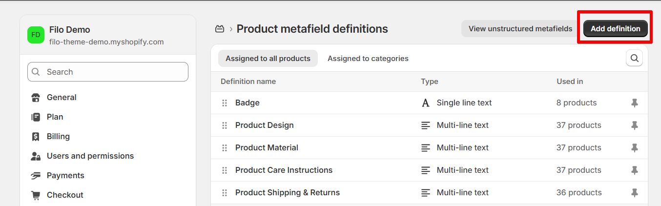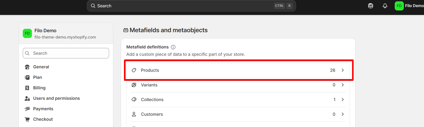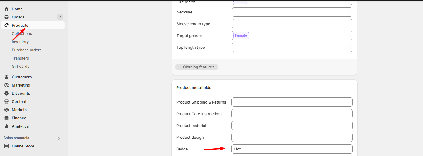 - Go to the product page in your admin and scroll down to the Product metafields section.