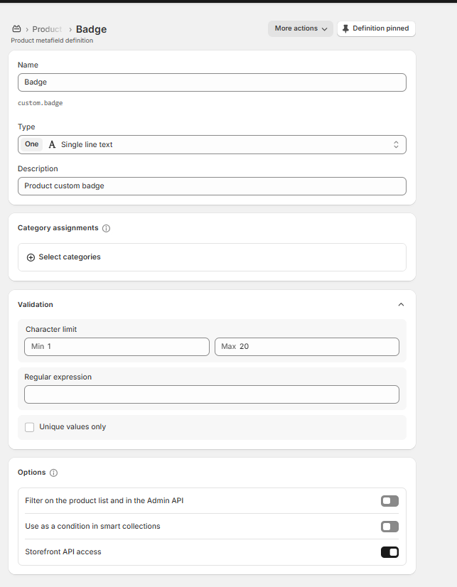 - In your theme settings, under the Badges tab, make sure the Custom Badge option includes the correct metafield name.