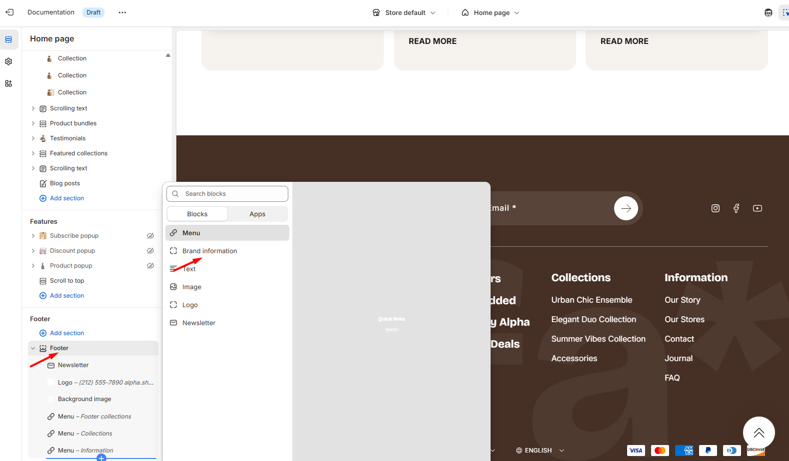 To see changes here after adding text or an image in the field, you should add the block “Brand information” in the footer through 'Add block'.