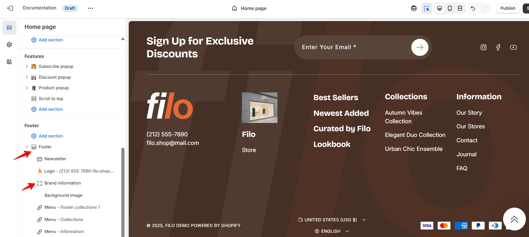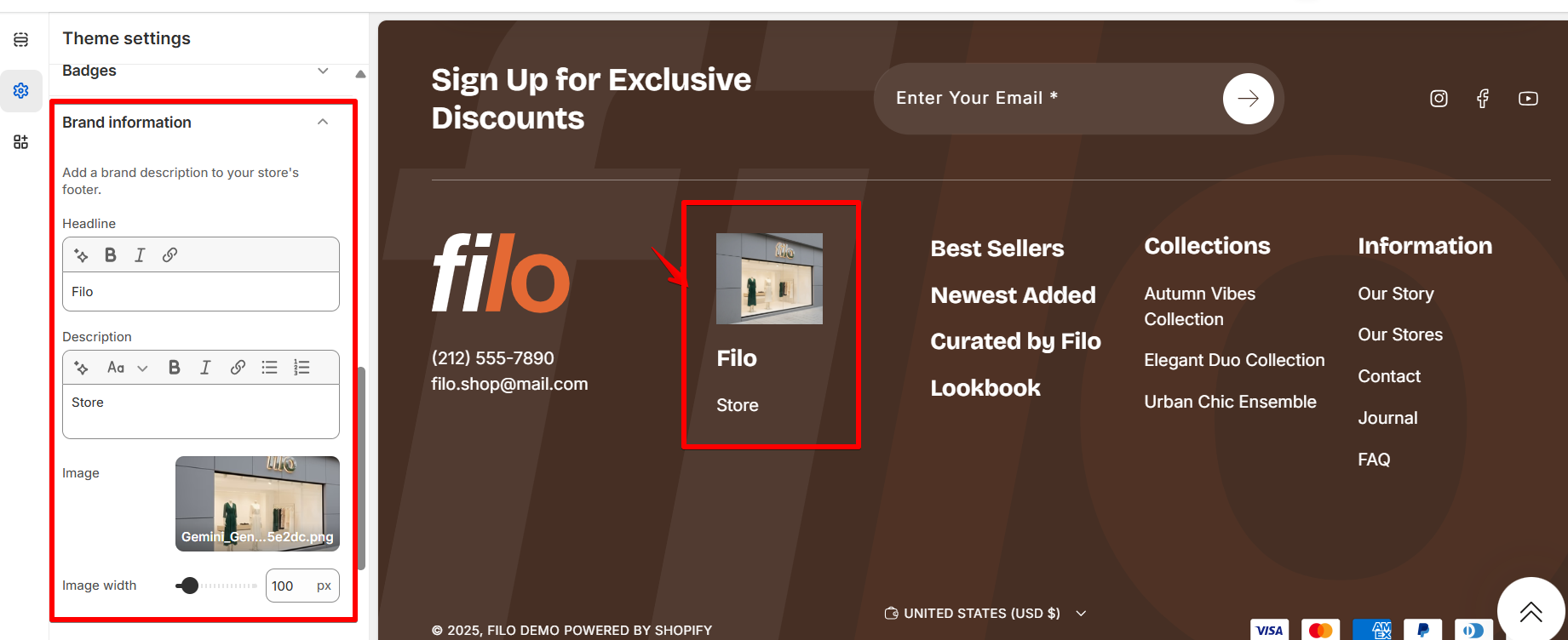Add essential details about your brand. Place a brand info block in your website's footer.