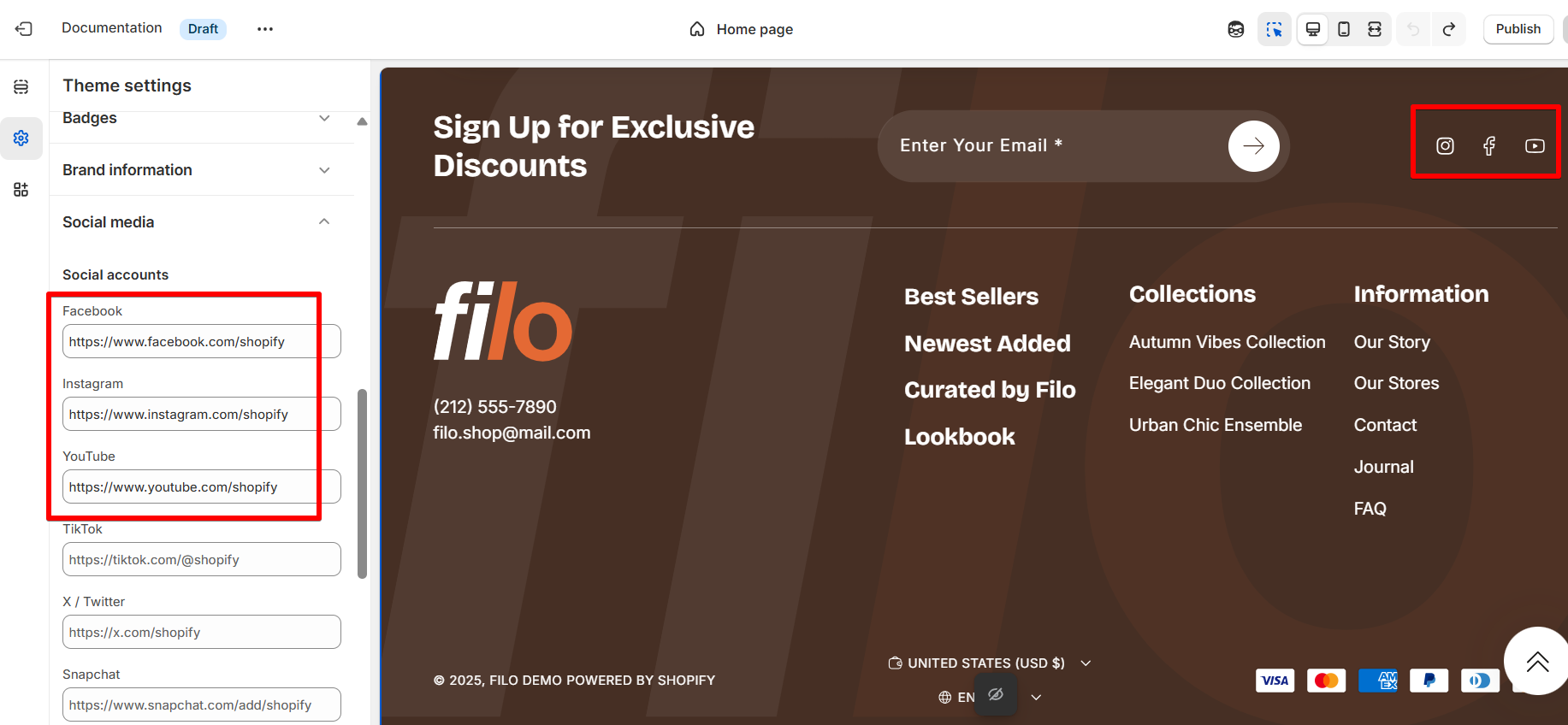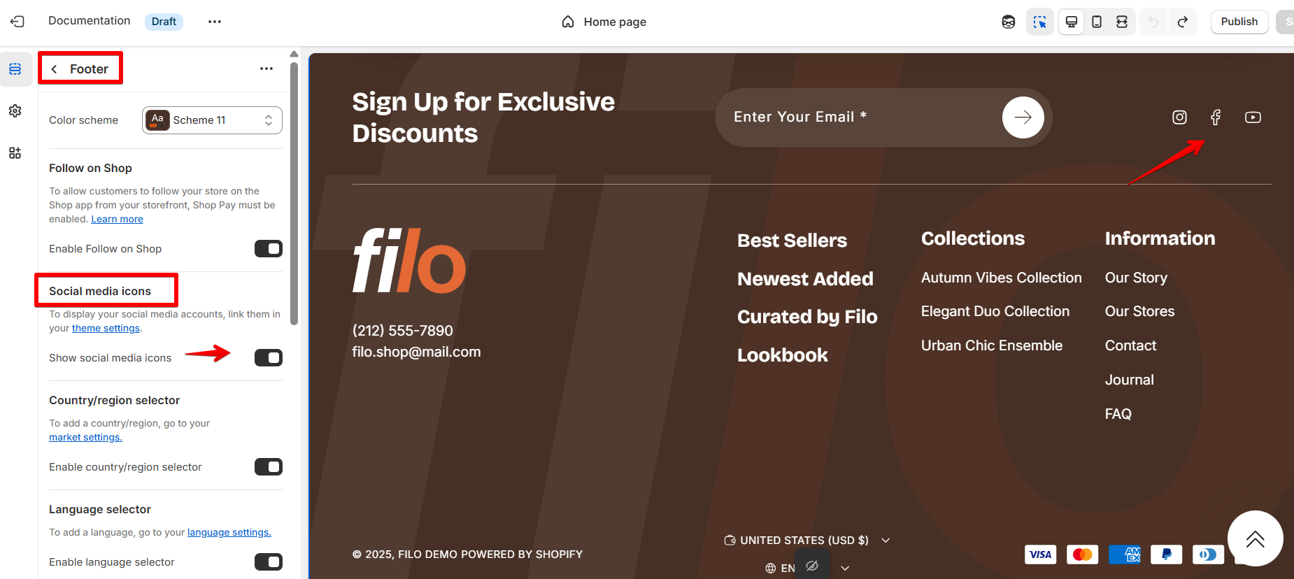 Ensure that “Show social media icons” toggle is enabled in the footer settings.