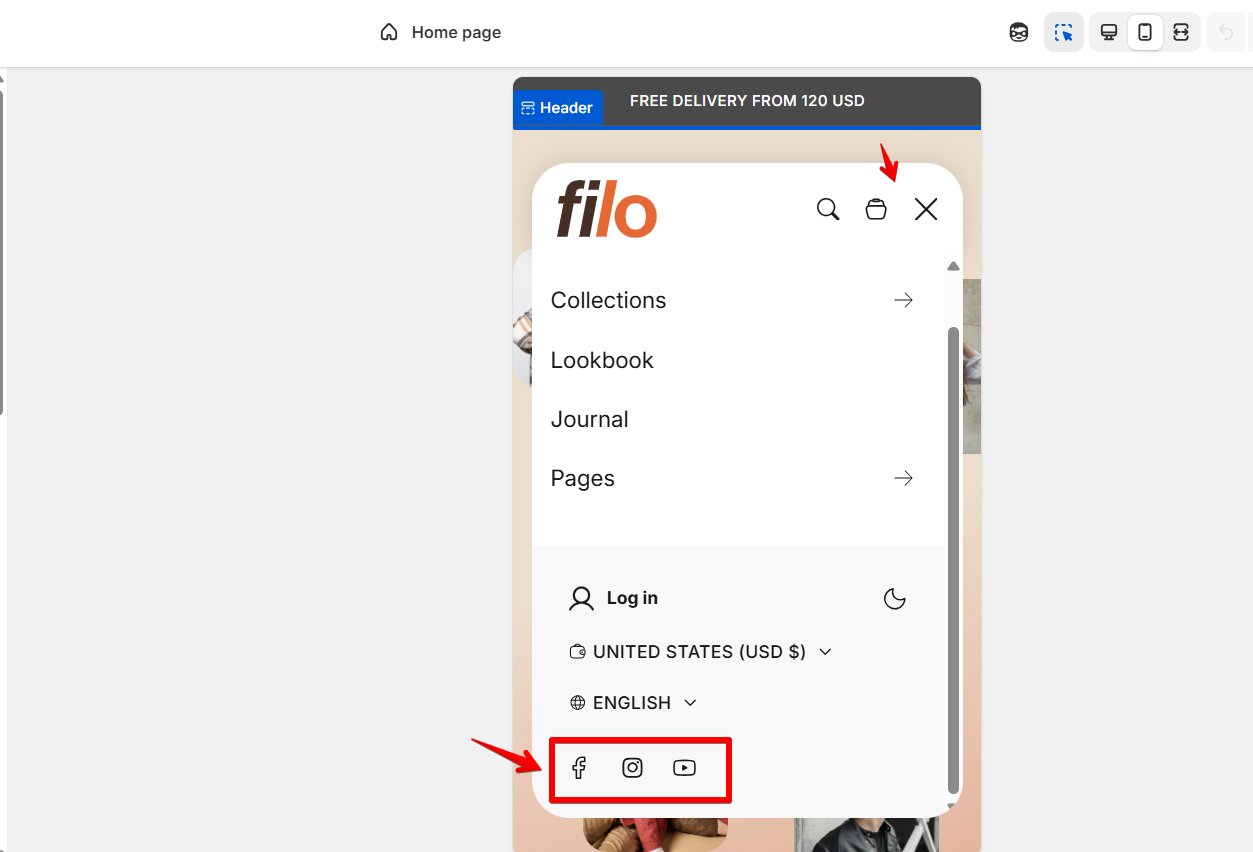 The icons for your added social media accounts will appear in the footer of your online store and in the header mobile menu, provided that the “Show Social Media Icons” checkbox is checked.