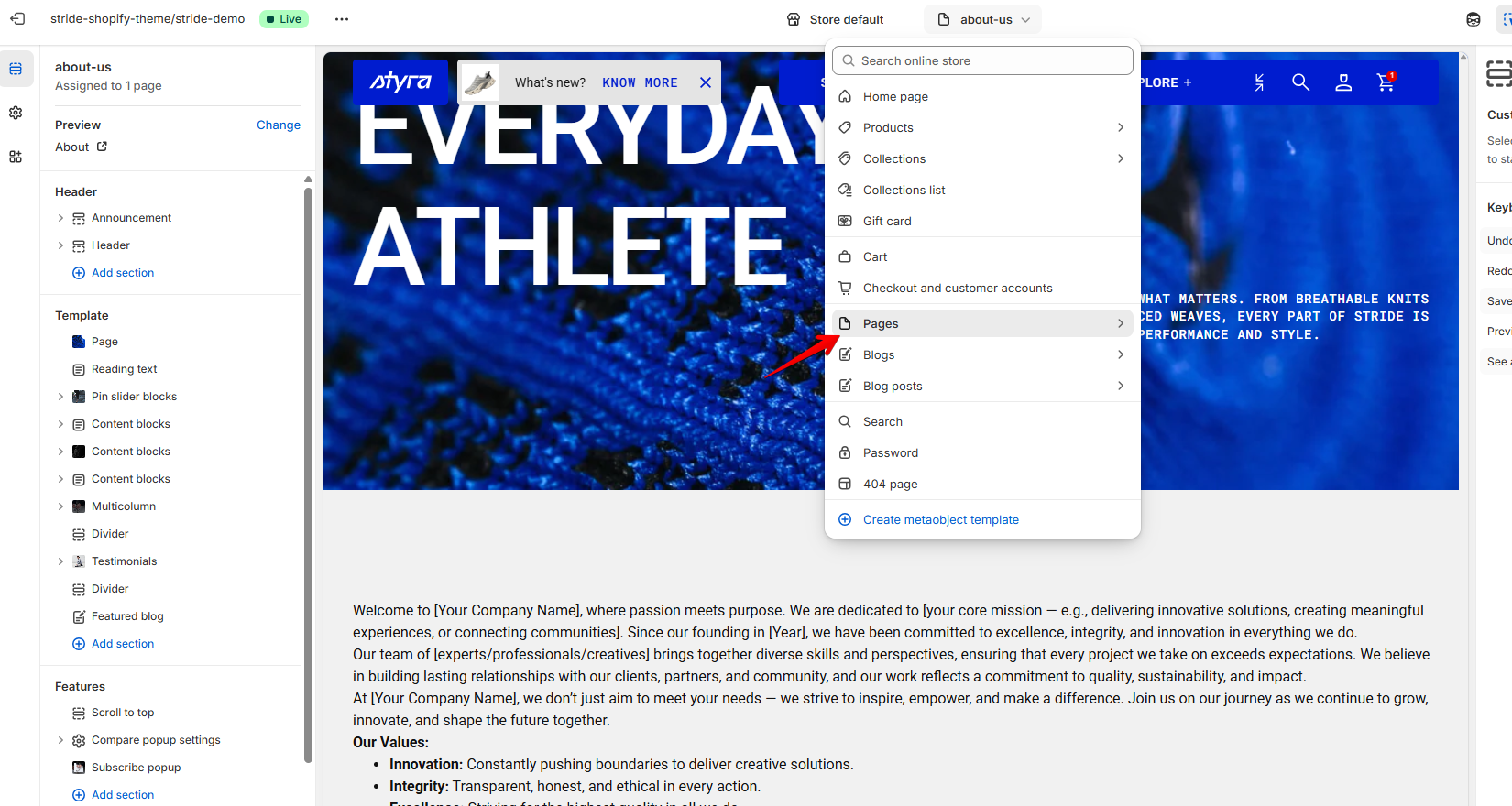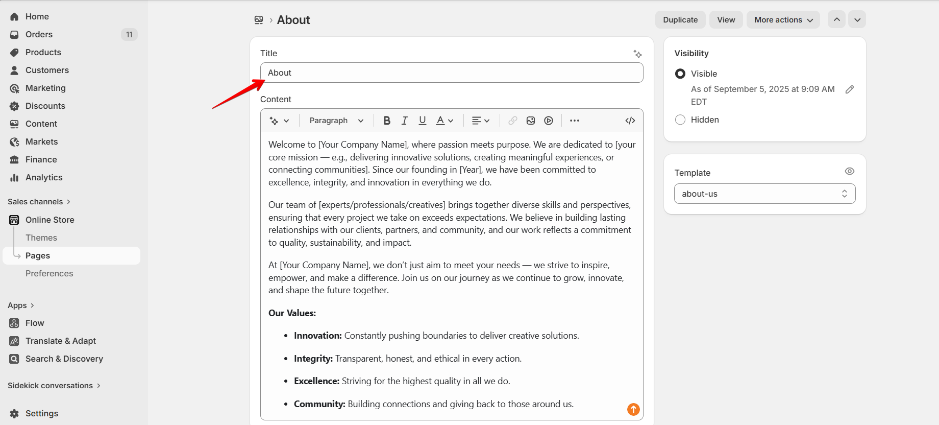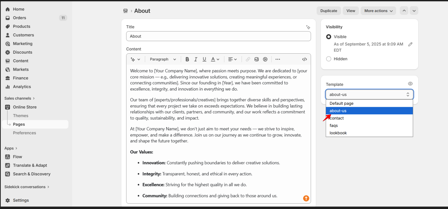 • Navigate to Online Store > Pages and open the page you want to connect.