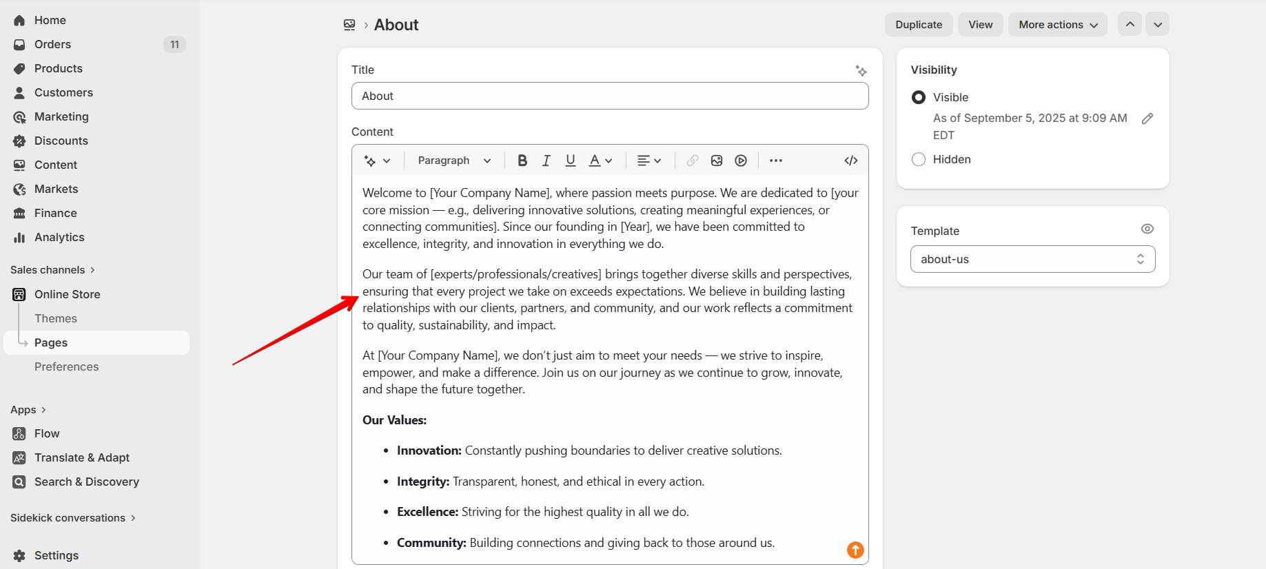 1. Navigate to Online Store > Pages in your admin panel.