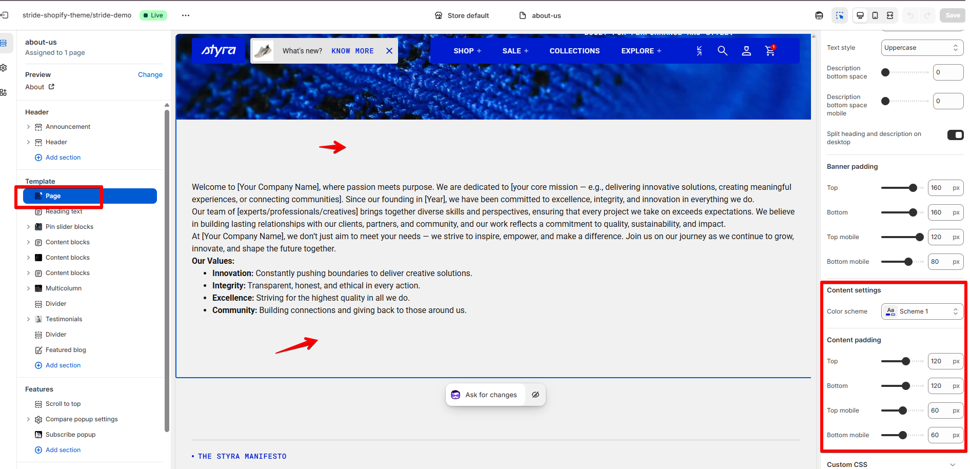 In the Page Template, you can adjust content settings to enhance the visual presentation of your page. You can set appropriate color scheme, top and bottom paddings.
