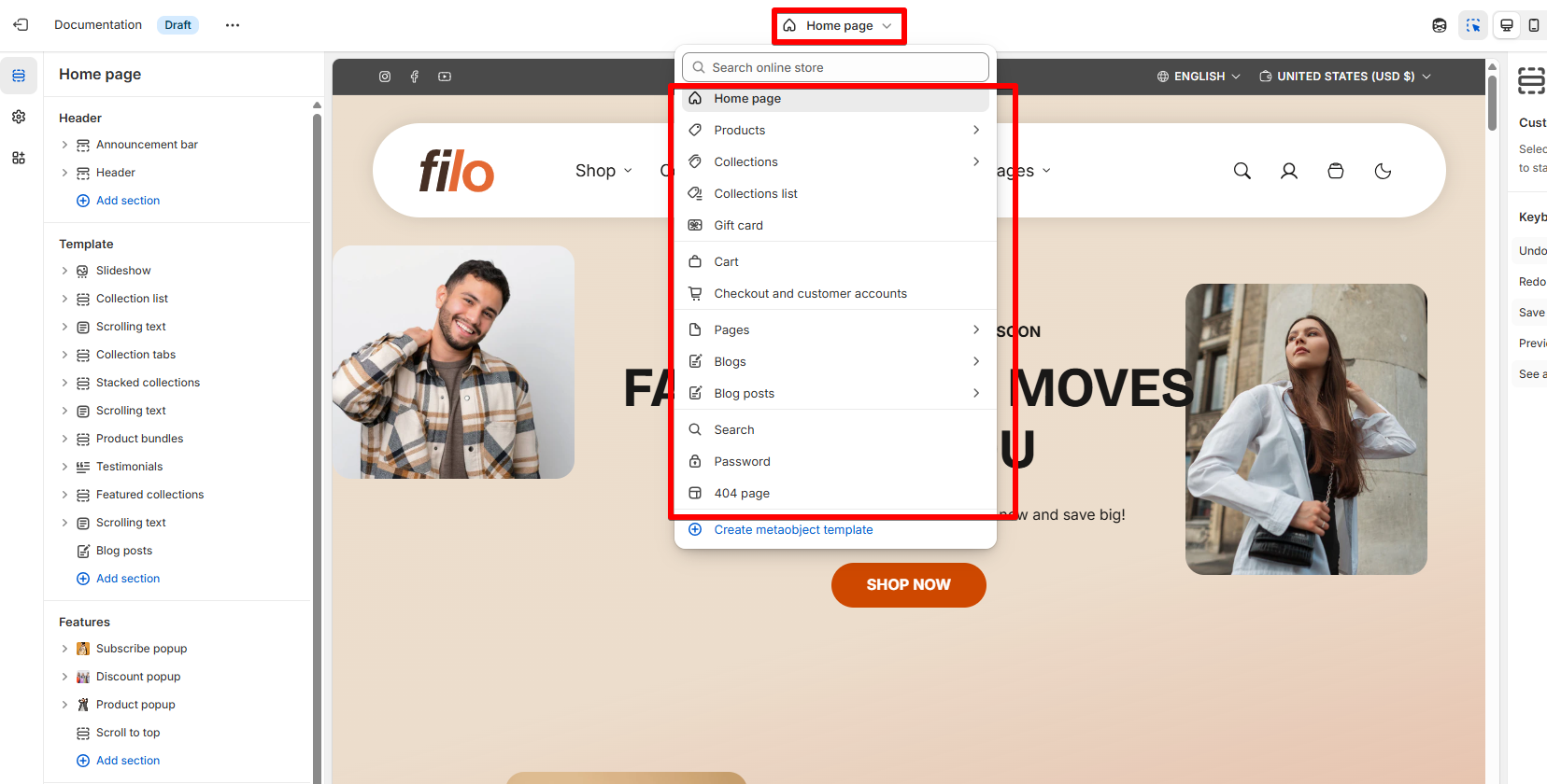 - From the dropdown menu, select the template that contains the section that you want to edit.