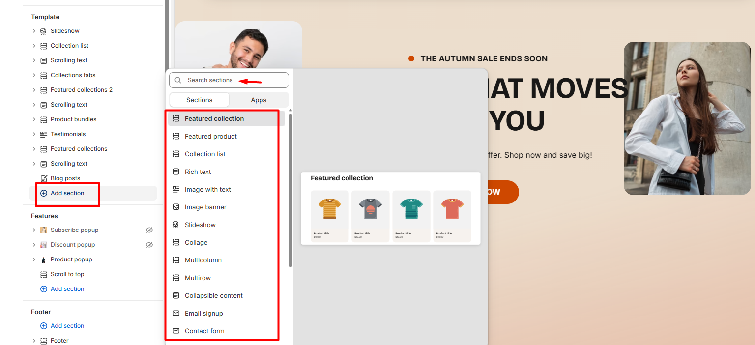 - Choose the type of section you want to add from the list, or search for a specific section using the search bar.