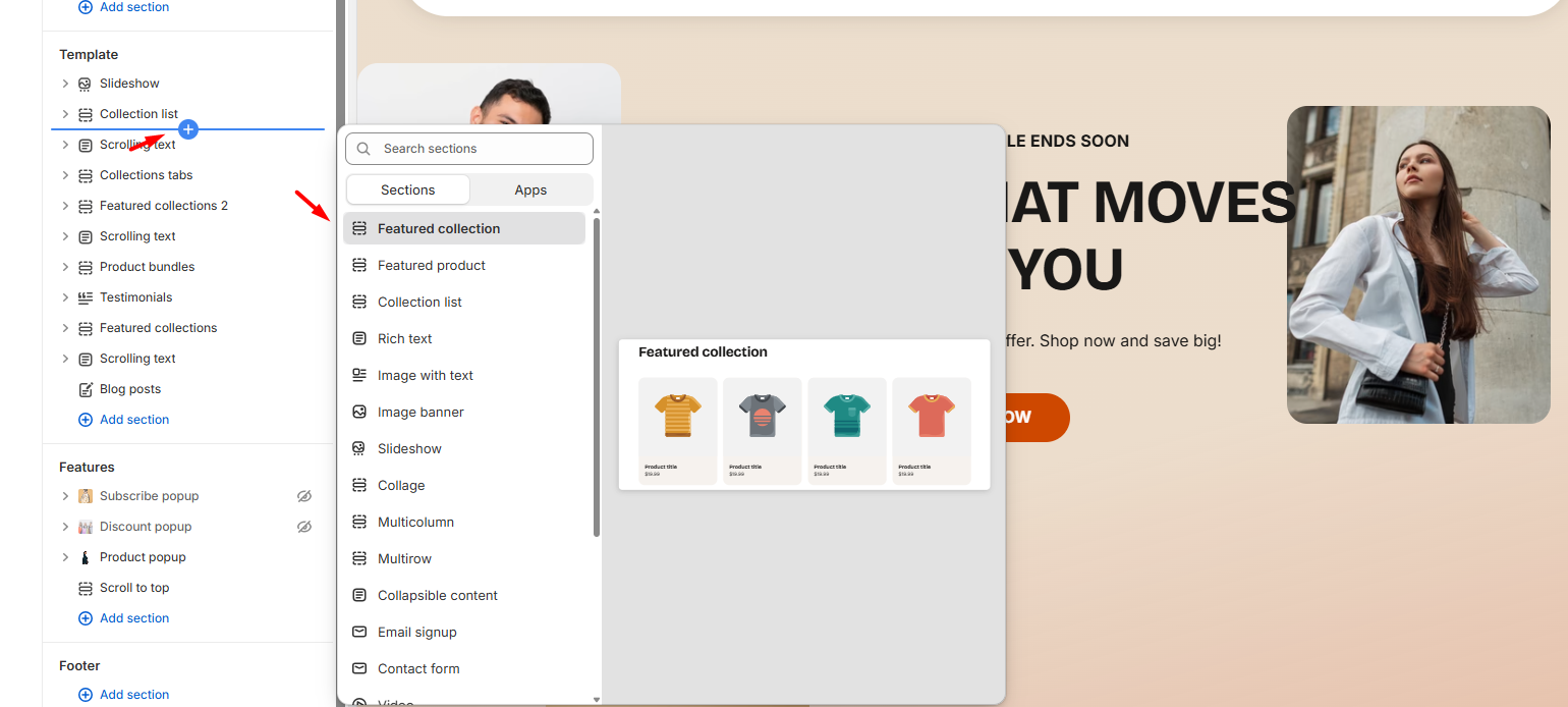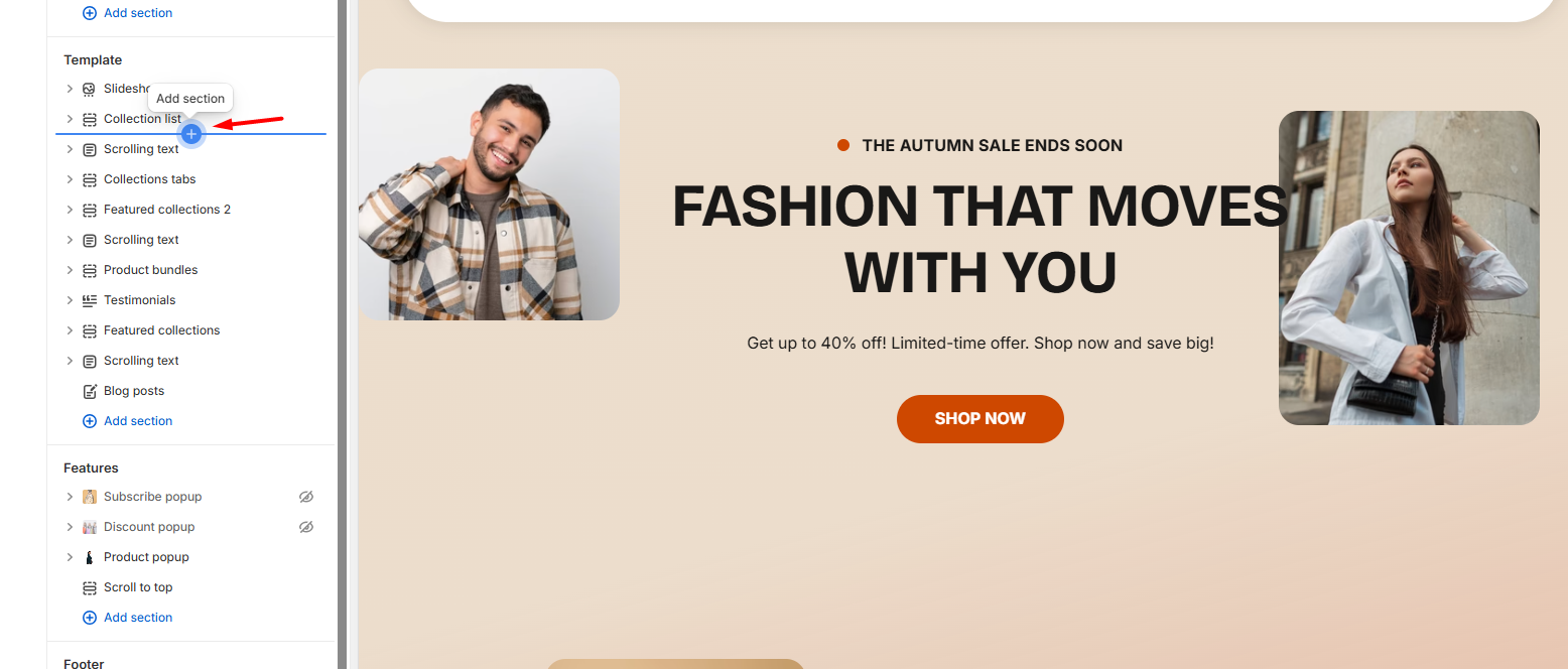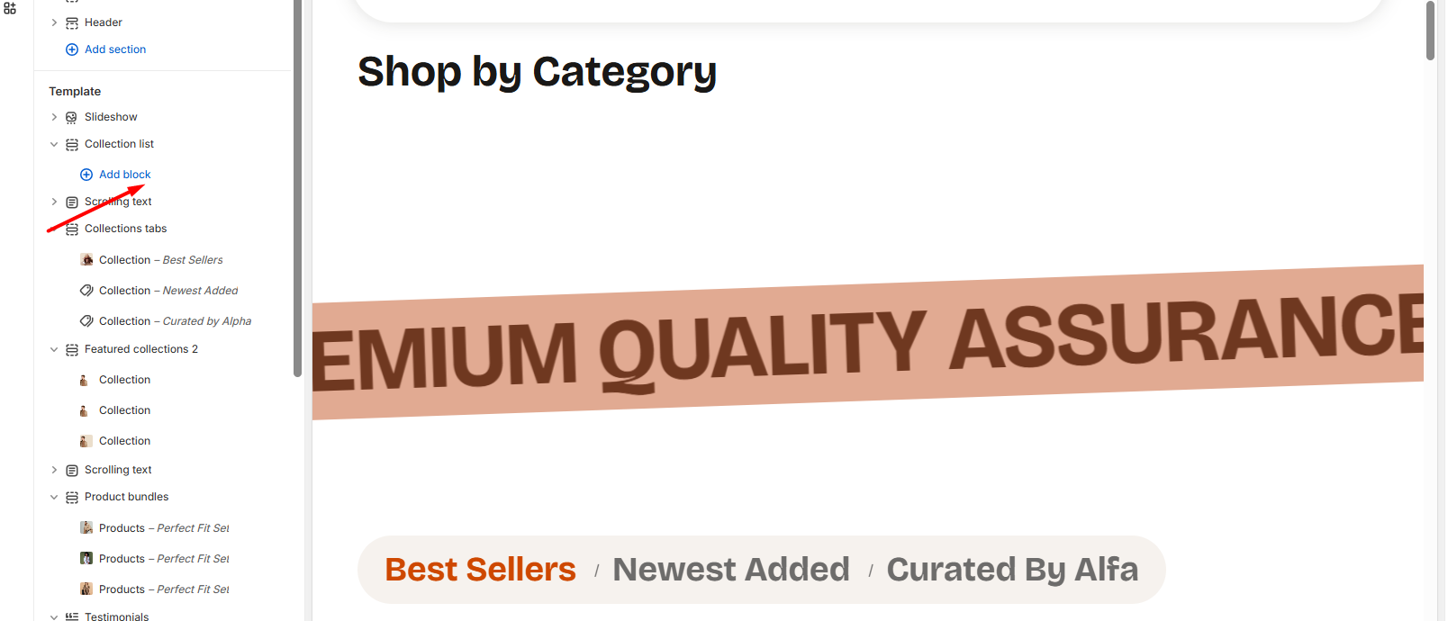 If you remove all blocks from a section or if a section after adding without any blocks that exist, you’ll see options like: Add Block, Add Collection, Add Column, and more.