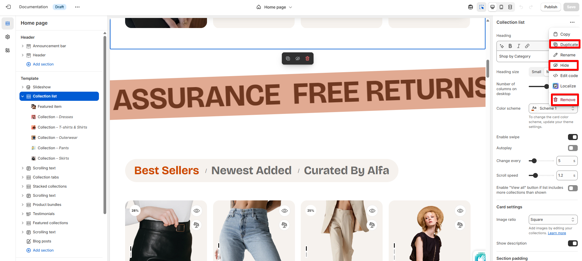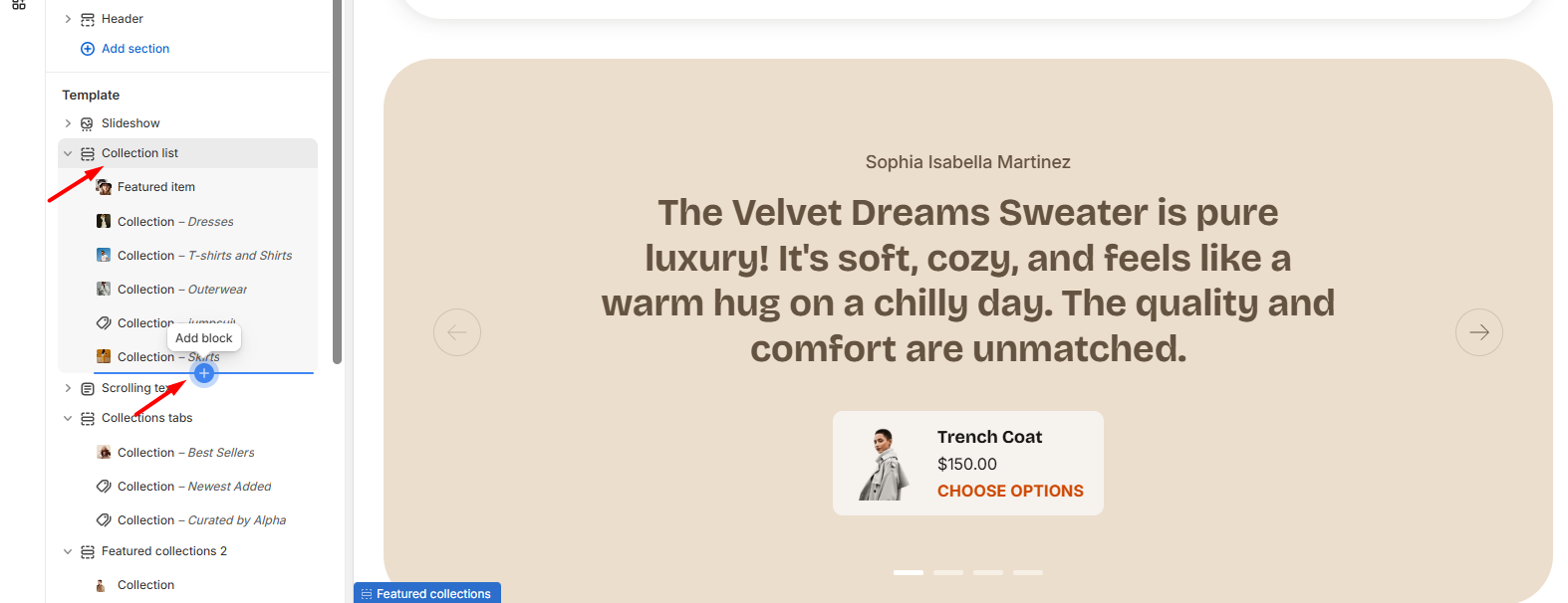 If you see “Add Collection” or “Add Column”, “Add Review”, you can add more collections or columns to the section with the same settings, providing flexibility in your layout. Customize each collection or column as needed.
