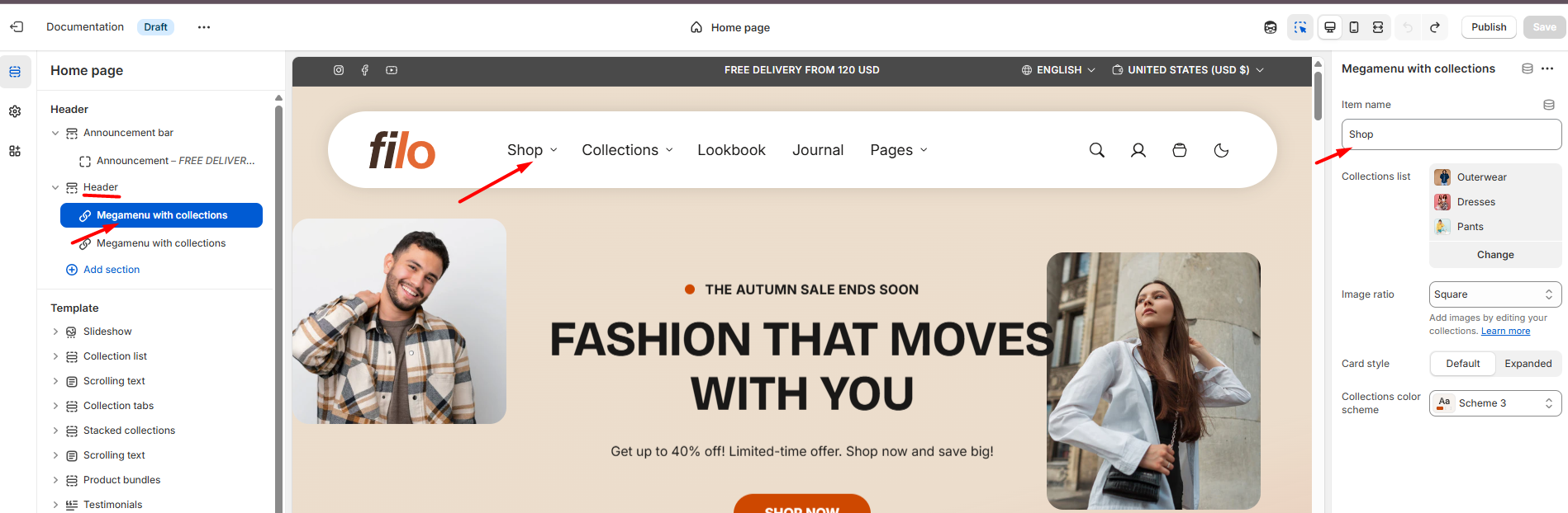 - Add the “Megamenu with collections” block and type the main menu item name (Shop) in its settings.
