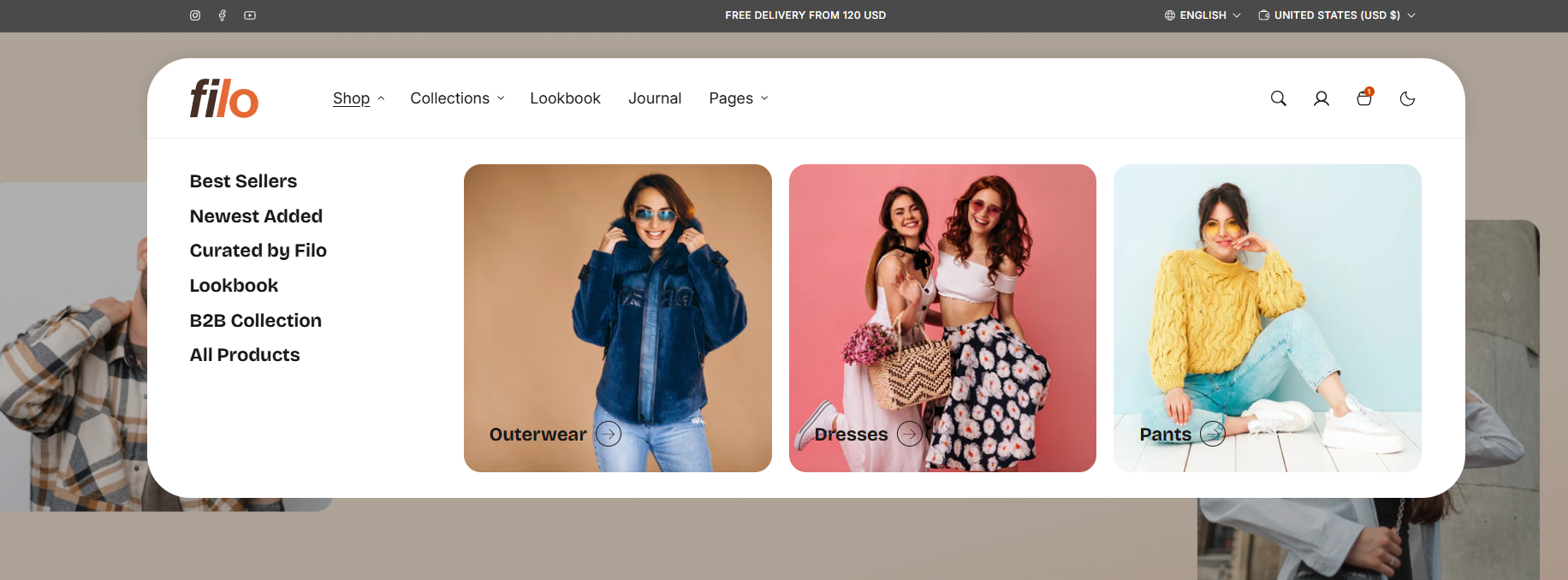 In the header, start by creating the main menu that serves as the primary navigation for your store. Once the main menu is established, you can add a mega menu with various layouts and designs to specific items within the main menu. This allows you to organize and display detailed submenus, enhancing navigation and user experience. Follow to the header settings article to check screenshot of main menu.