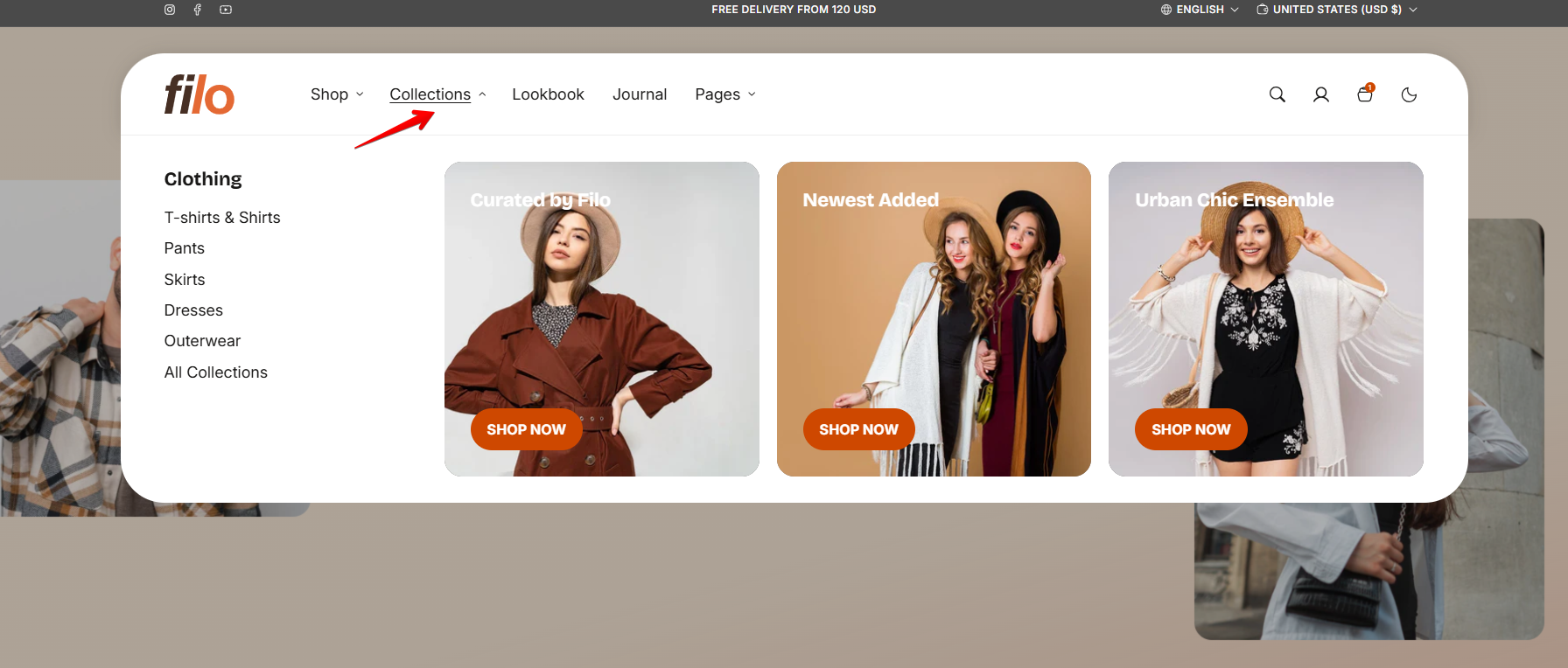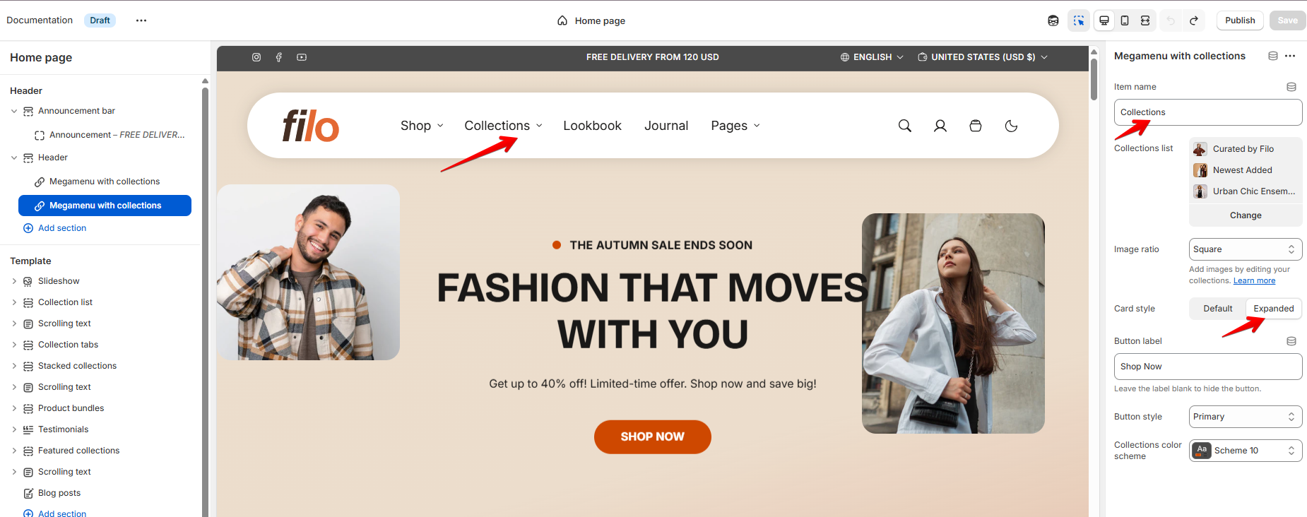 - Add the “Megamenu with collections” block and type the main menu item name (Collections) in its settings.