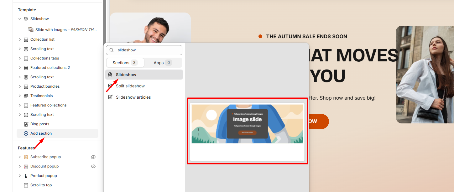 - On any theme template, click “Add section”