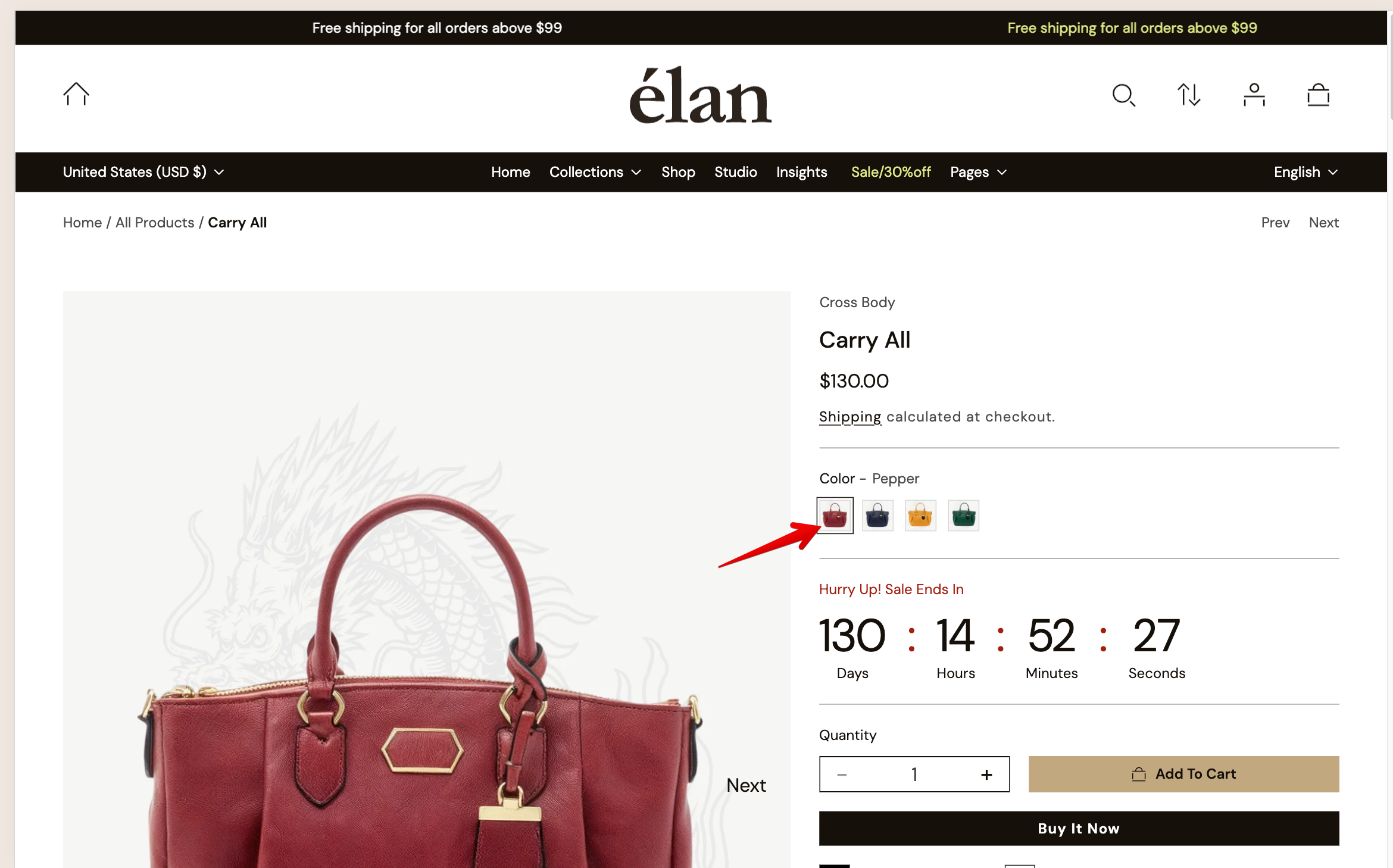 Color swatches are colorful buttons that can be placed on a product page. They replace the traditional drop-down menu or pills and allow customers to ‘click’ on the color button to see different colors of the product.