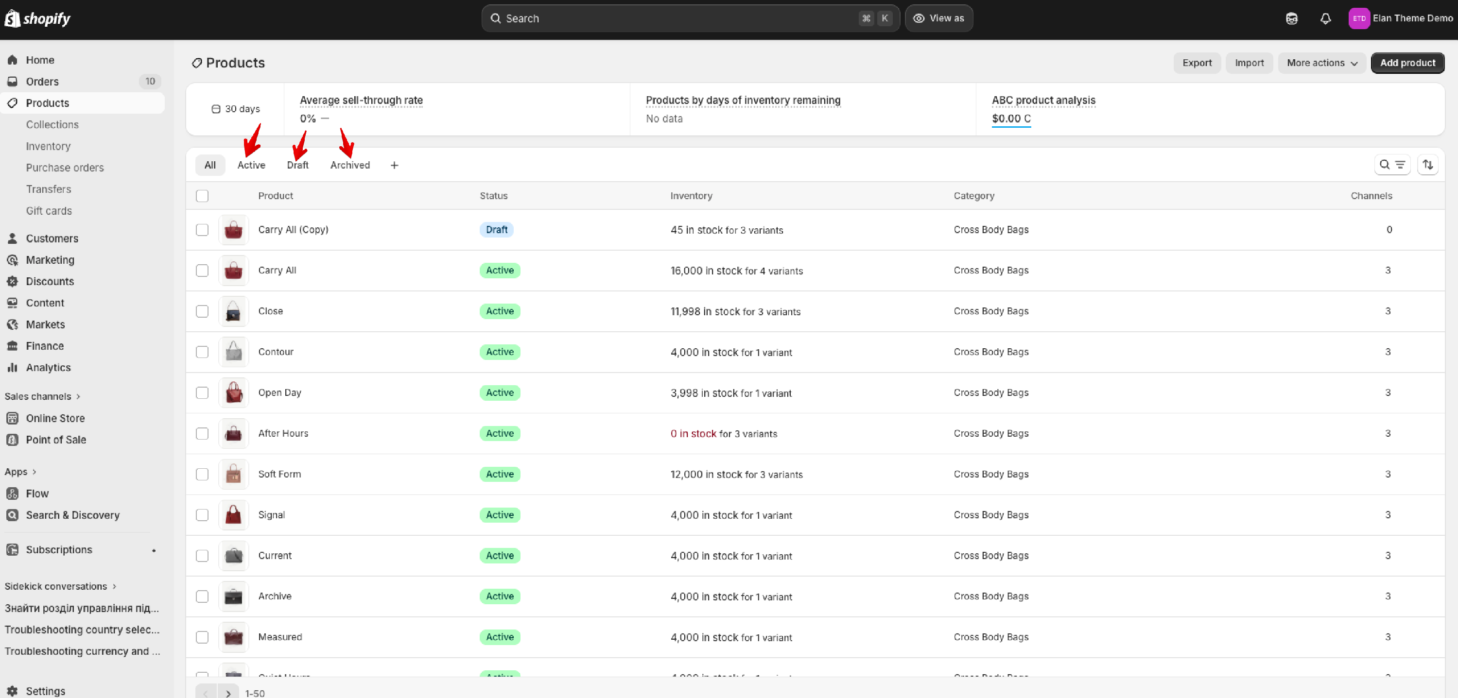 You can oversee your products comprehensively. Within this section, you can access all products, whether they're active, in draft, or archived. Furthermore, you can perform various actions such as removing a product, setting it as draft or active, and adding or removing tags. Utilizing the search icon, you can swiftly find specific products. Additionally, you can employ the arrows icon to sort products, and you can also alphabetically arrange categories and vendors.
