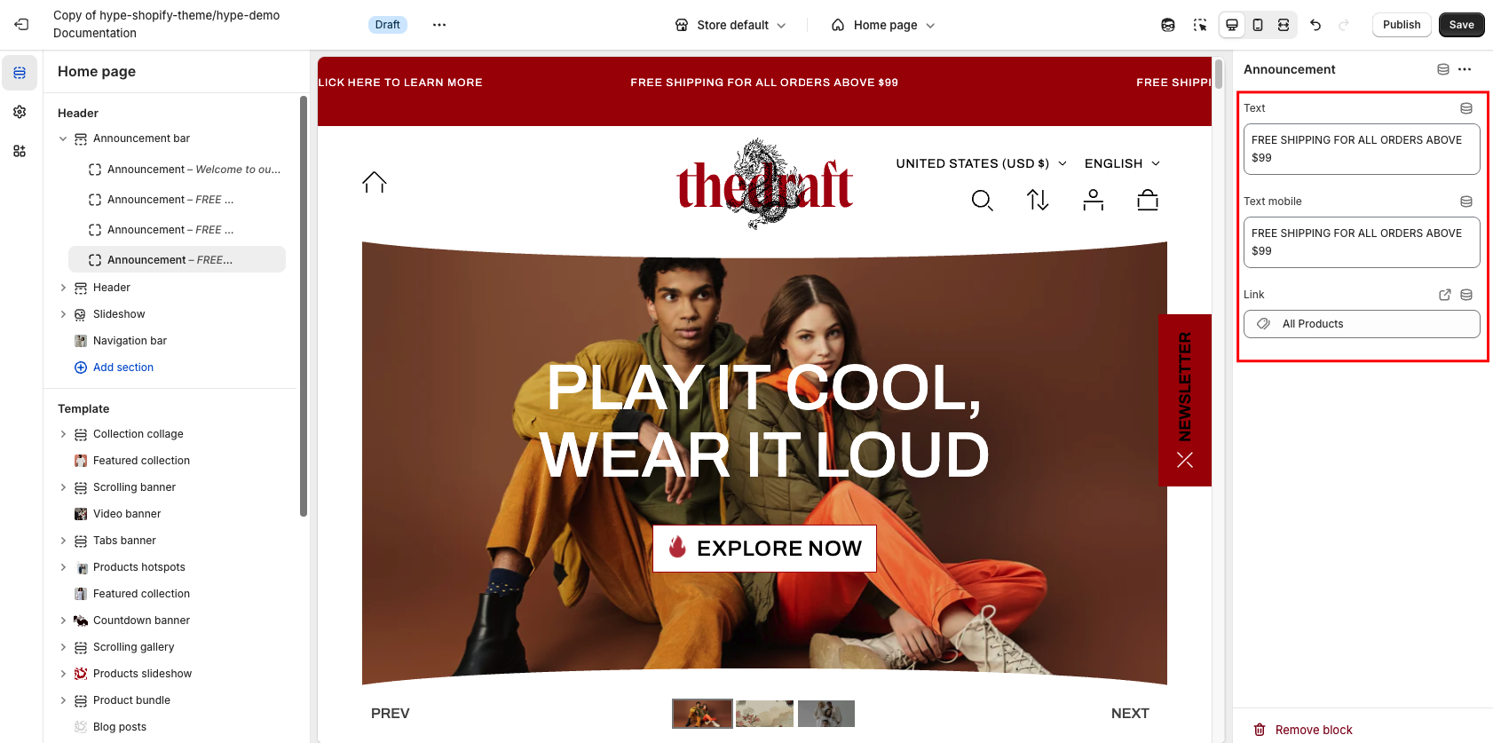 | Text | Add custom text to your announcement bar to share important updates, promotions, or news with your customers. |