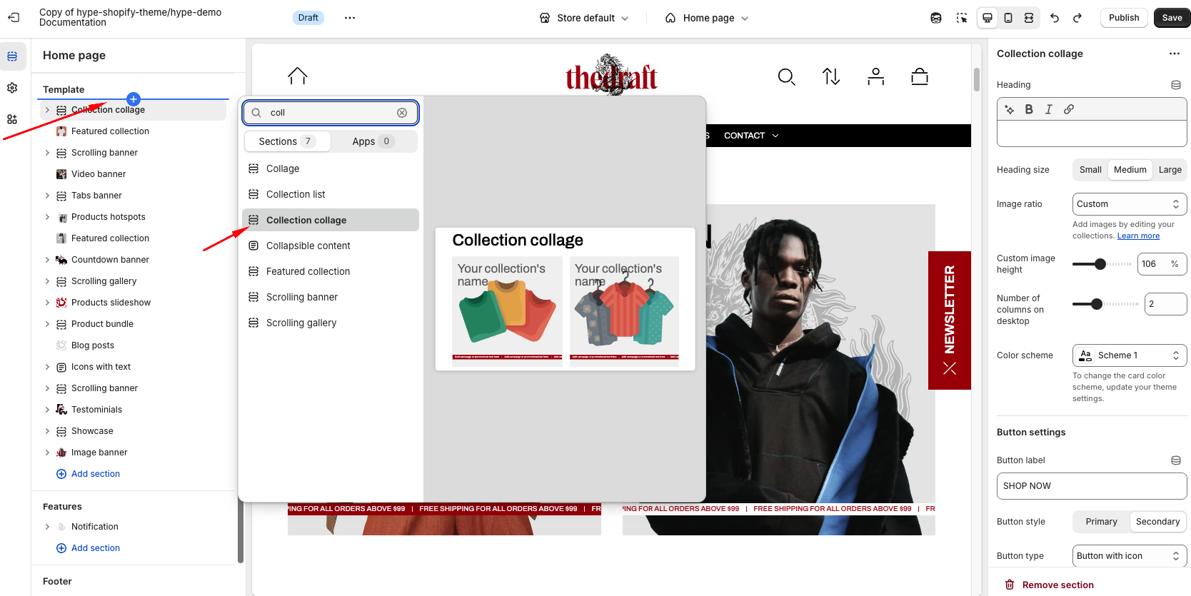 This guide describes the Collection Collage section. Use this section to display a series of collections as collection cards. Each collection card can include the collection title, a button for quick navigation to the collection, and a scrolling text strip at the bottom of each collection card.