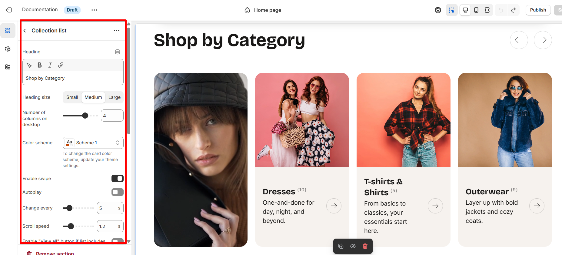 The Collection List section helps you efficiently organize and showcase product catalogs in a flexible, visually engaging layout. Designed with enterprise needs in mind, it supports multiple layouts, including grid view on desktop, column view on mobile, and carousel/slideshow formats on both.