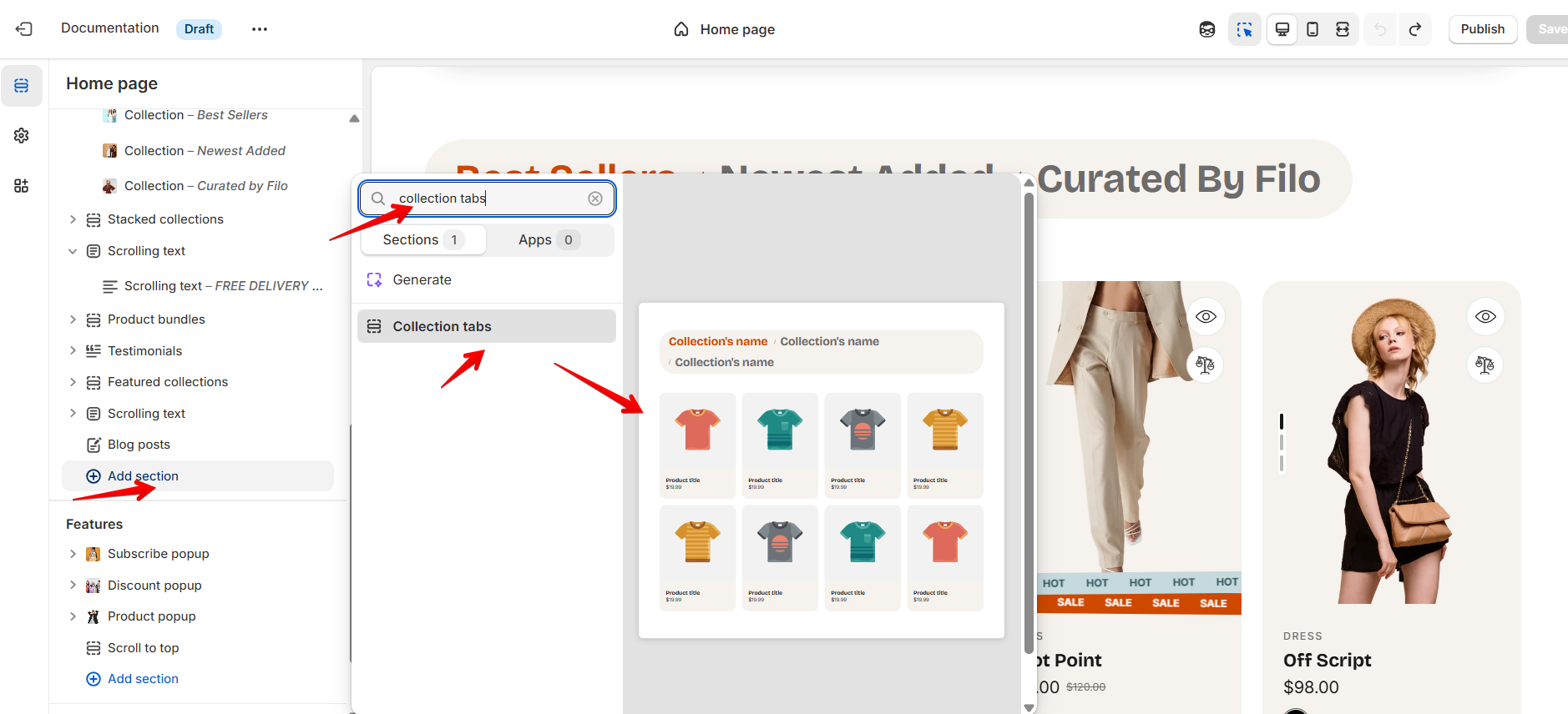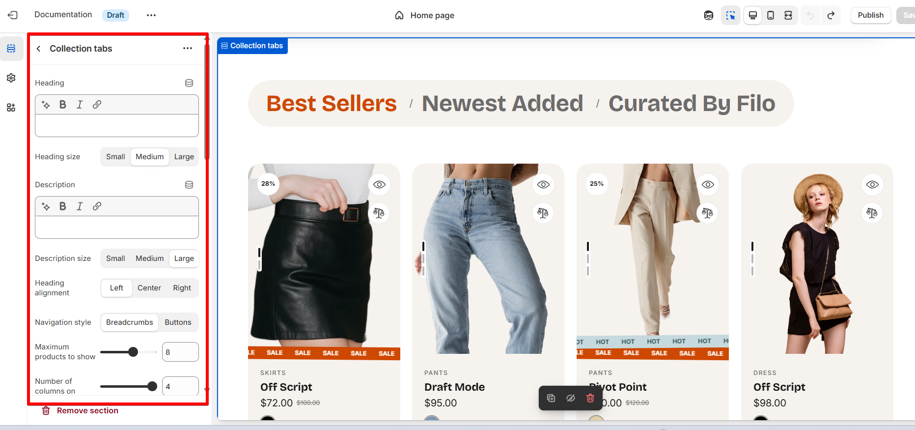 The Collection tabs section allows store owners to display multiple featured collections in a single, organized layout using tabbed navigation. Each tab represents a different collection, and clicking a tab updates the product grid below to show products from that selected collection—without reloading the page. This creates a smooth and engaging browsing experience for customers.