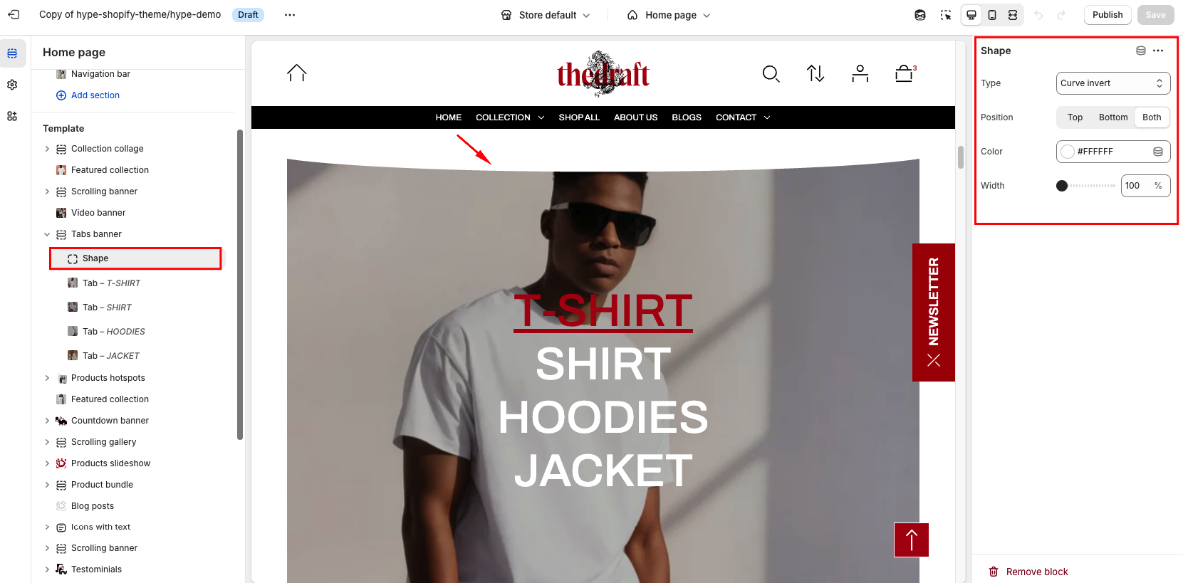 The Shape block allows you to create a unique shape for the section. Simply add this block and choose your desired shape settings. The settings apply to all slides added in the section.