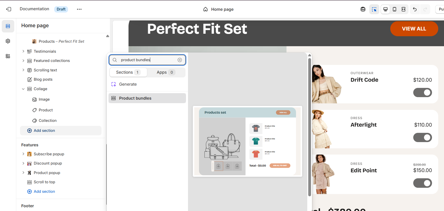 The Product Bundles section lets you showcase a group of related products together on the homepage or product page. Customers can:
