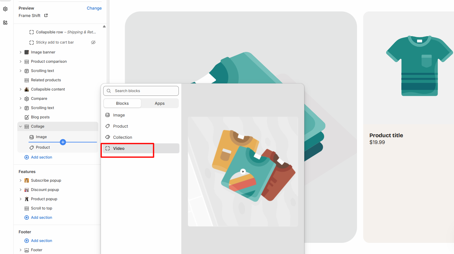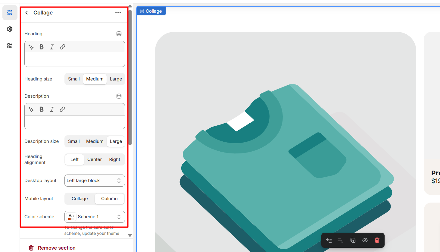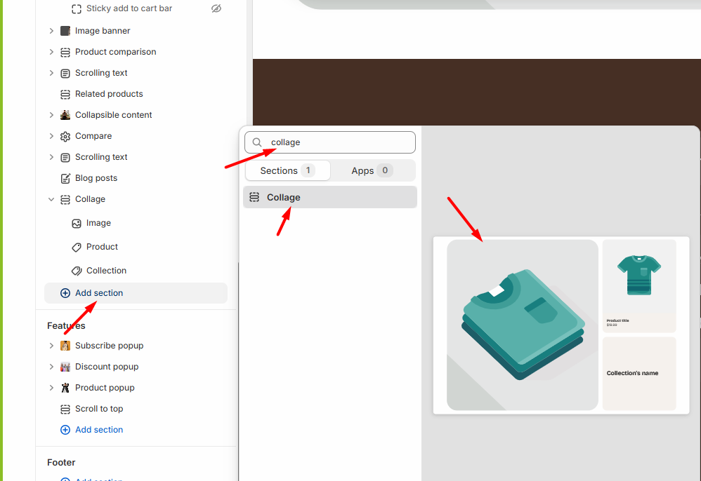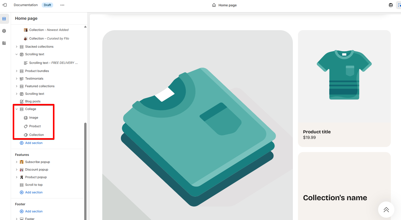 The Collage section allows you to create a visually dynamic layout by combining image, product, collection, or video into a unique design. This section is perfect for showcasing content in a creative and engaging way.