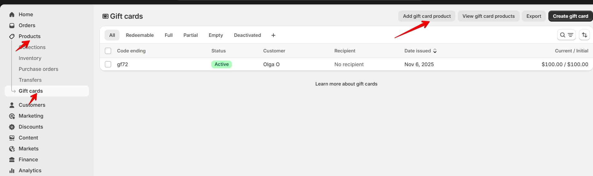 Go to Products > Gift Cards.
