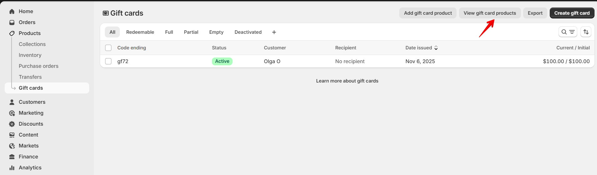 After creating, you can view gift card product. Click on View gift card products.