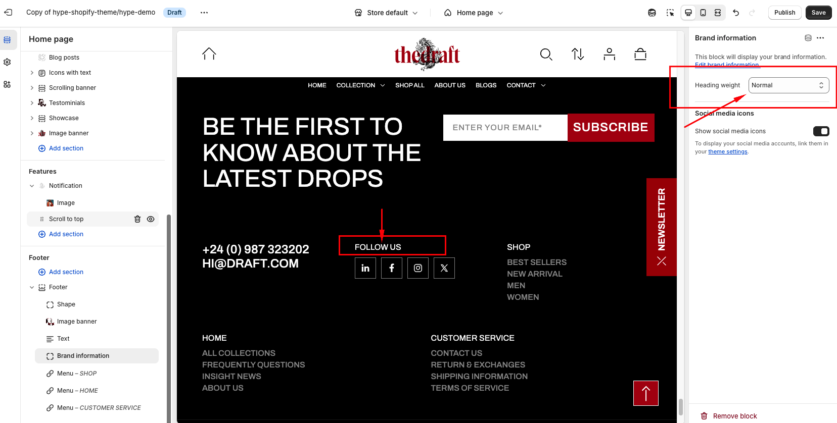To customize all this block, you should navigate to theme settings and find ‘Brand information’ tab. Before adding and changing something in options, make sure that this block is added in footer. Add block ‘Brand information’ through “Add block” after clicking on Footer.