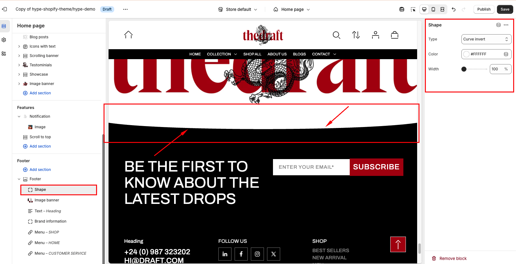 The Shape block allows you to create a unique shape for the footer. Simply add this block and choose your desired shape settings.
