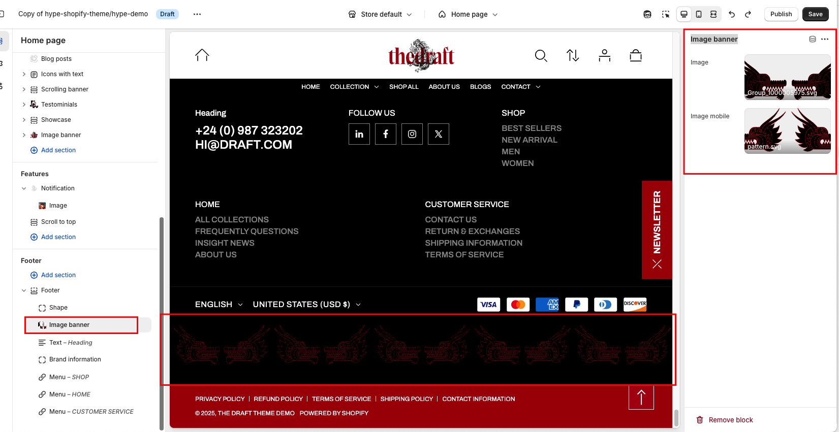 This block allows you to additionally style the footer. Use it to upload images that will be displayed at the bottom, above the policy links.
