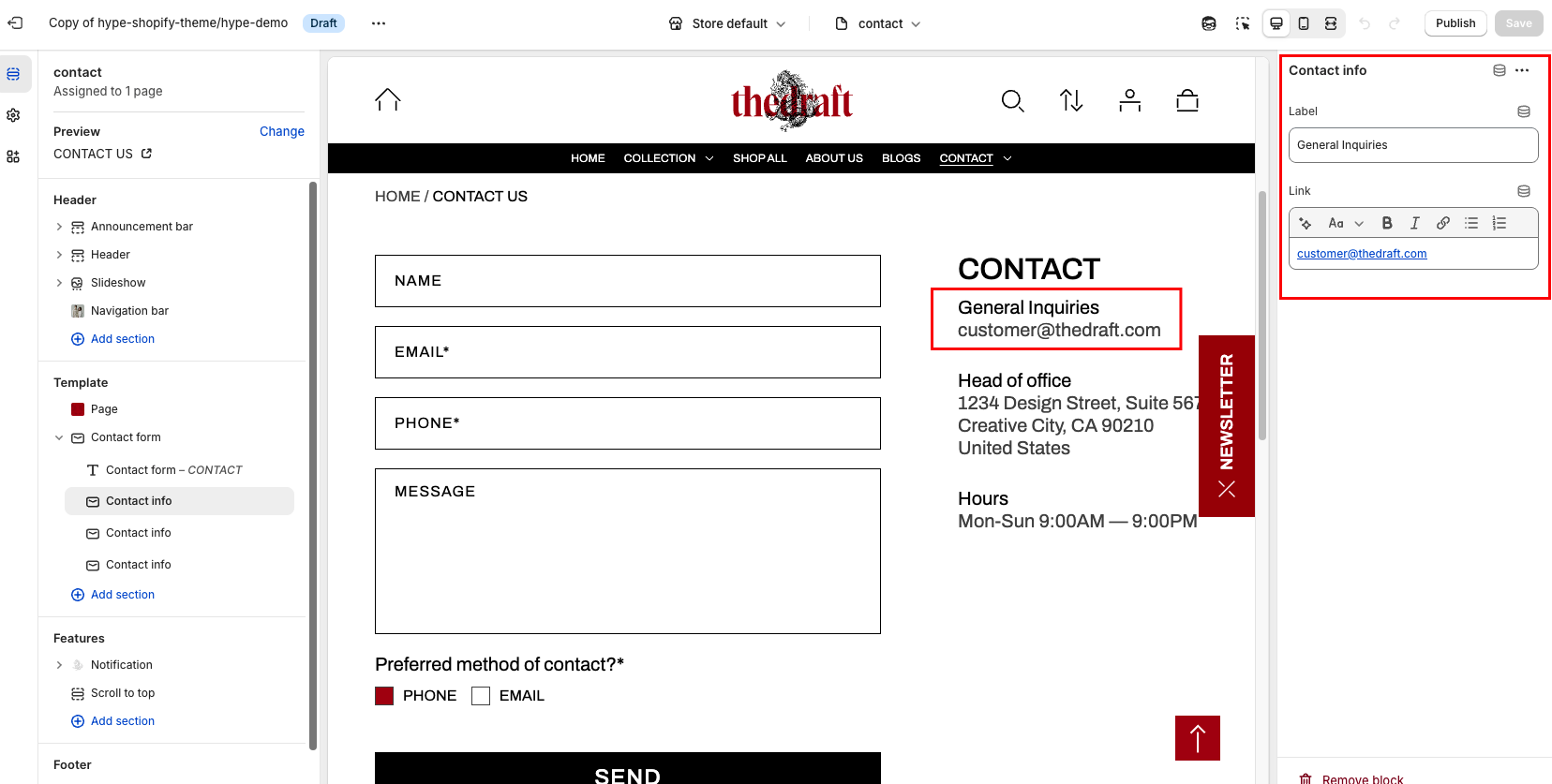 Use the contact info block to add extra details alongside the contact form. This block also supports hyperlinks, making it useful for displaying your store’s contact information, such as address, phone number, or email.