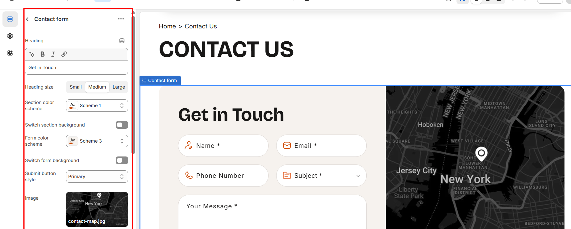 Once the “Contact form” section is added, you can customize its appearance and functionality using the available settings.