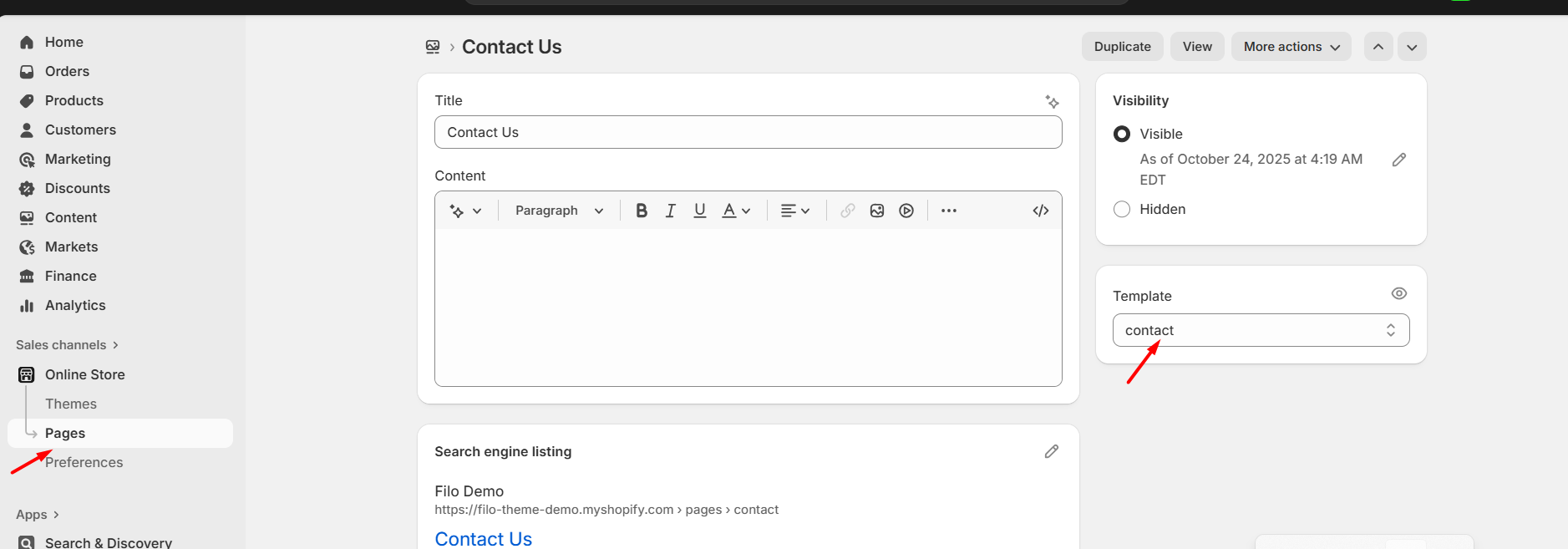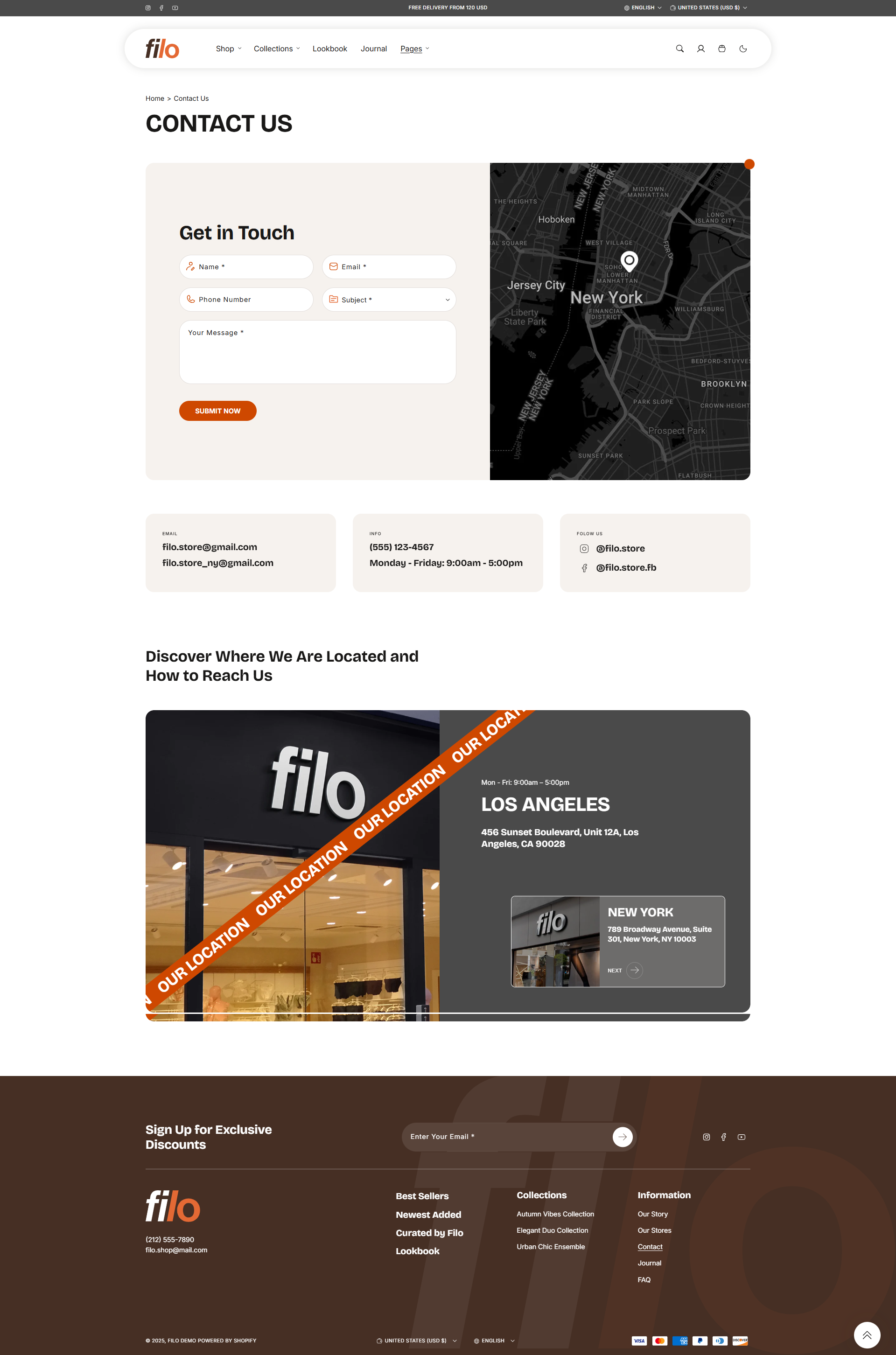 In the demo store, we’ve created a contact page using a custom page template and the main contact form section. Additional sections have been added to enhance the layout and create a more visually appealing and informative contact page, offering both functionality and strong design.