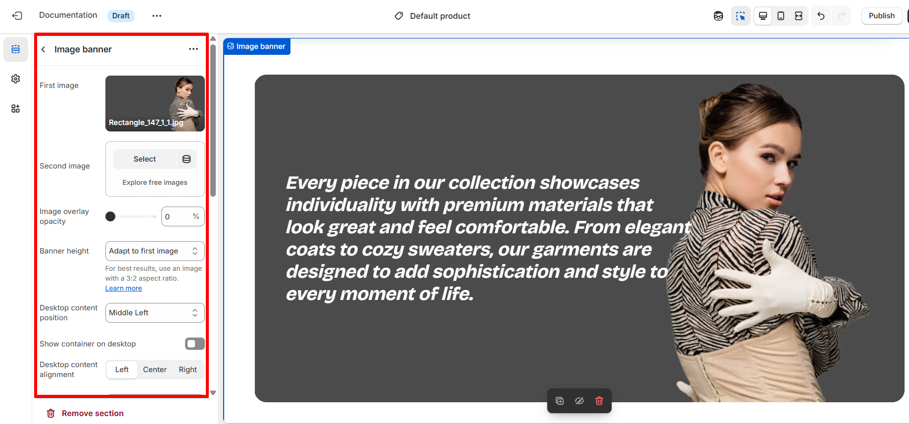 Use this section to display an eye-catching banner for highlighting promotions, collections, or brand messaging in a bold and engaging way. The banner can be displayed in full width or inside a standard content container, matching the layout of other sections.